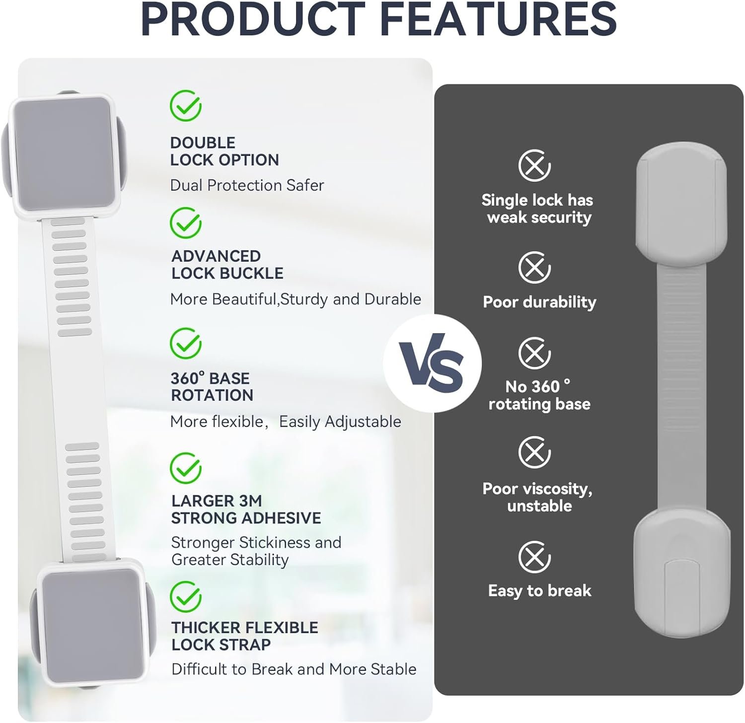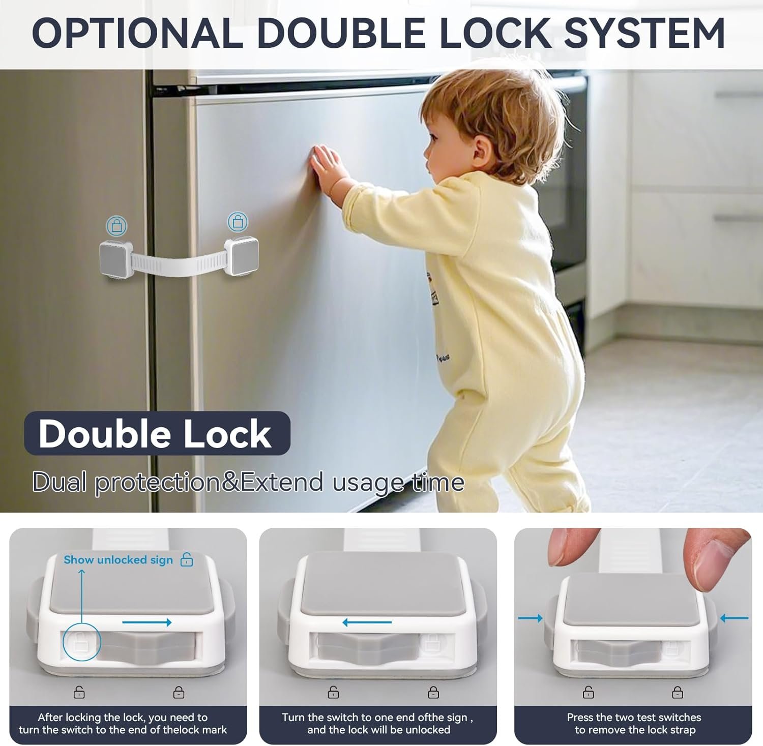 Keep your little ones safe with our Baby Proofing Safety Locks, featuring a Double Lock Option for enhanced security against curious toddlers. These reliable, BPA-free locks are equipped with adjustable straps length to fit diverse household areas like cabinet locks baby proofing, drawers, fridge doors, dishwasher panels, oven handles, pet doors, toilet seats, and trash can lids. Widely used by parents, babysitters, and daycare centers, they ensure effortless baby proofing with tool-free installation—securely locking hazardous zones while delivering peace of mind.