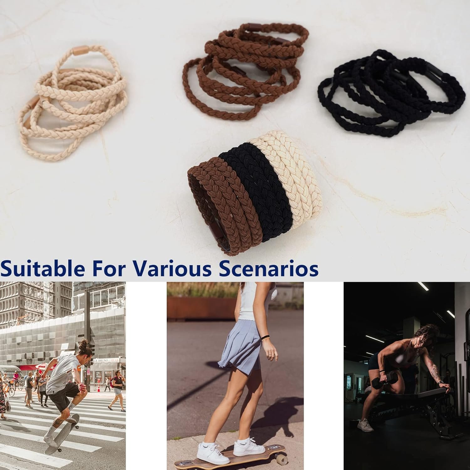 UNIQUE DESIGN – Braided hair ties for men women, braided with flat, wide elastic bands. The three earth colors of black, brown and khaki are used, so that your style is no longer limited to black.