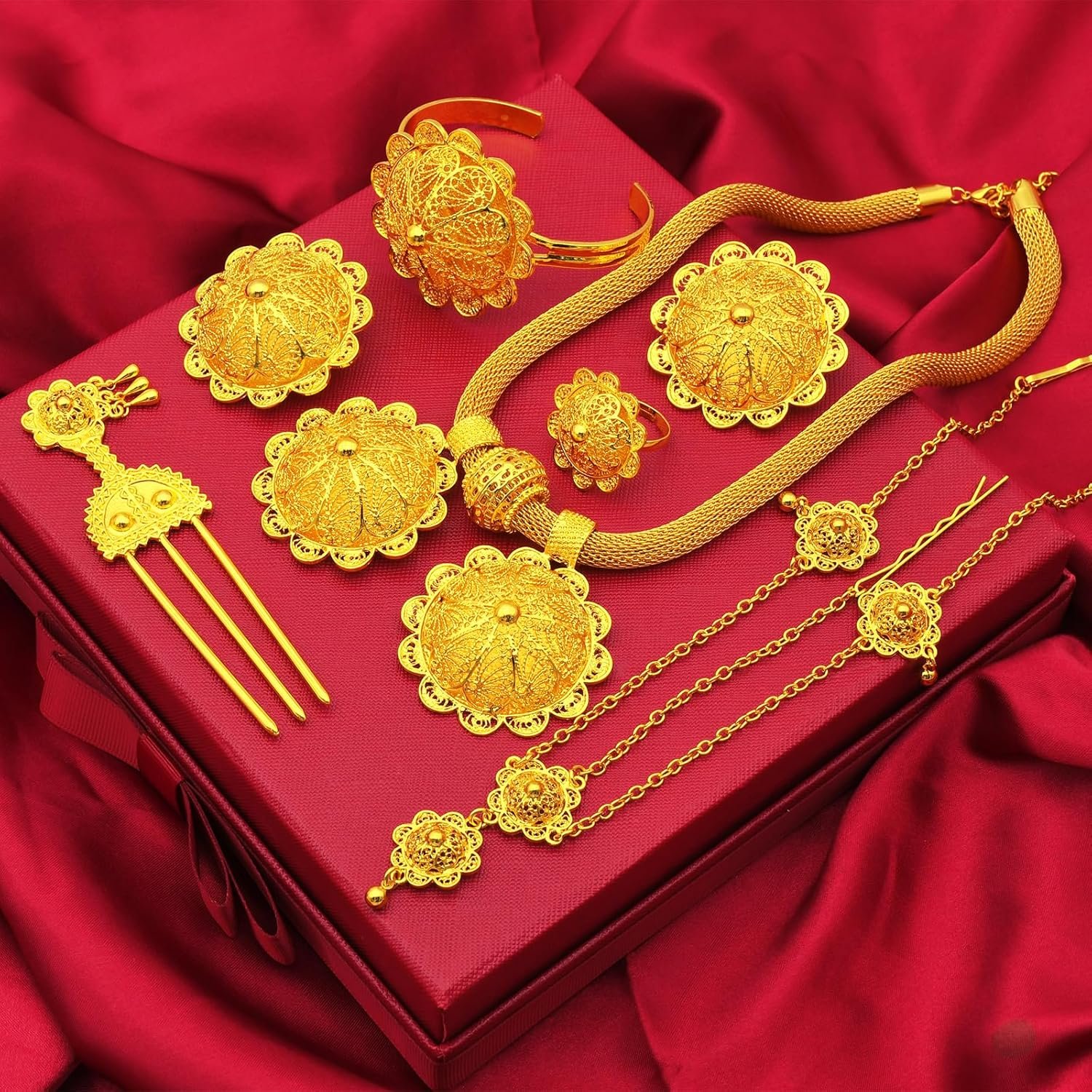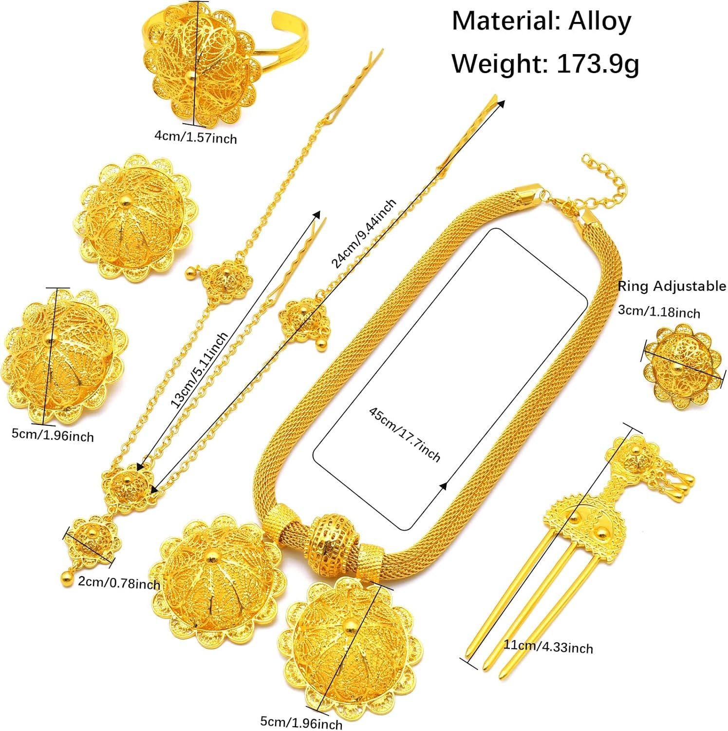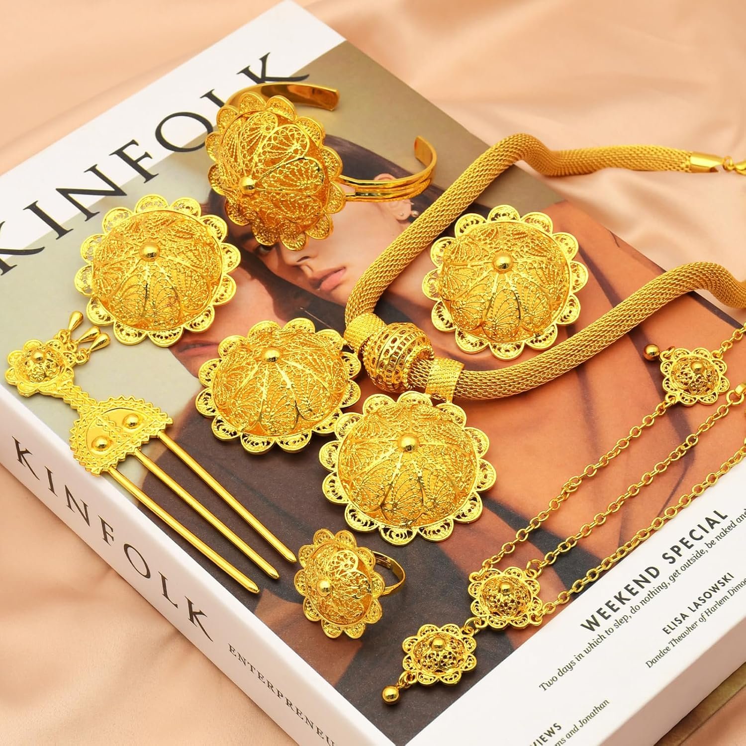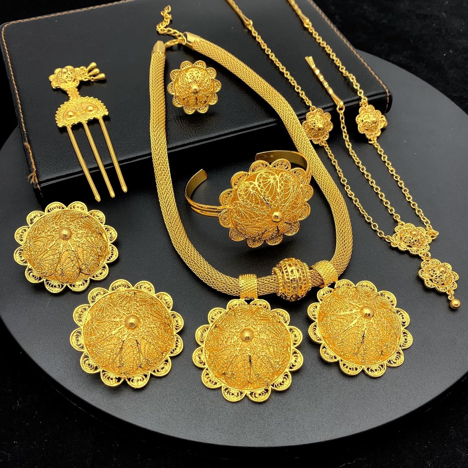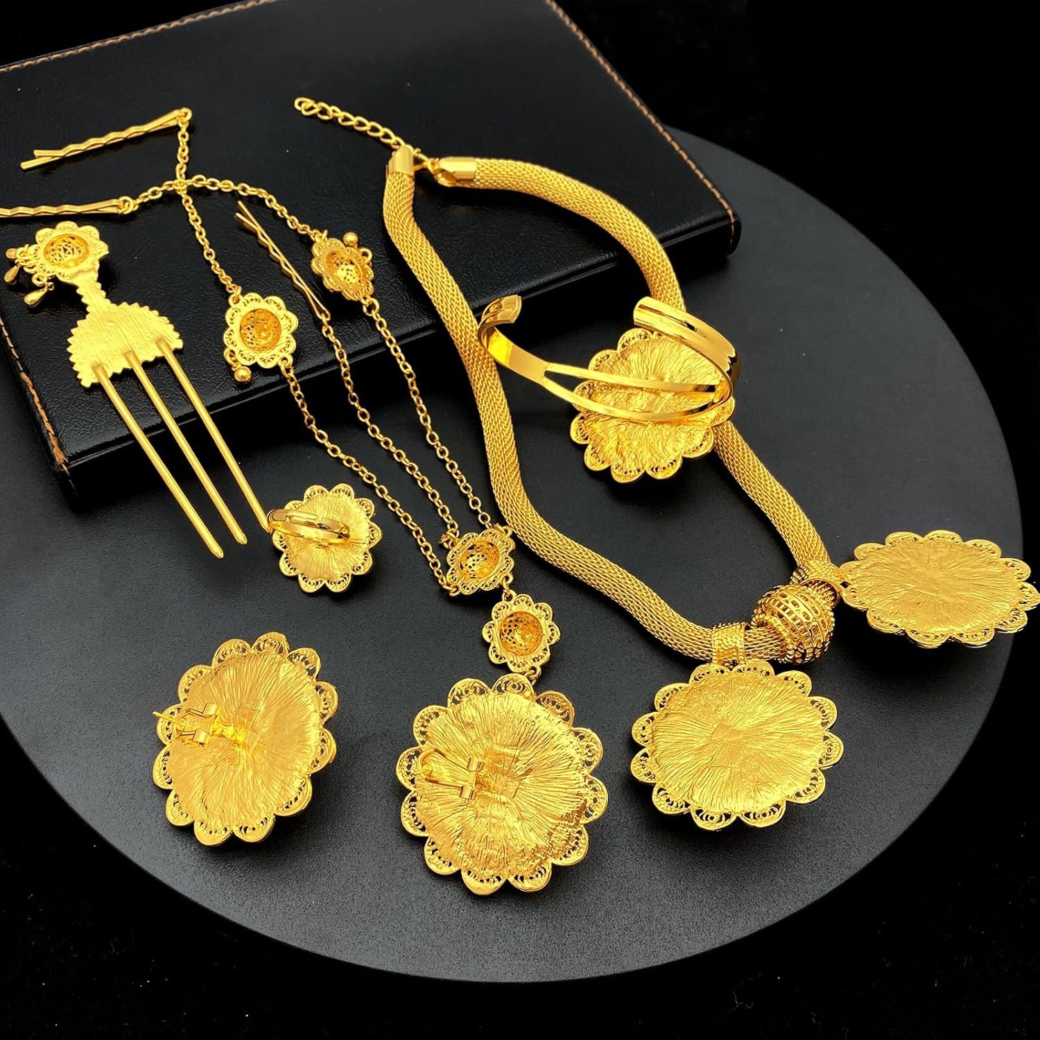 24K Gold Plated Ethiopian Jewelry Sets for women Wedding Party Bridesmaid Habesha Necklace Ring Hairpin Bracelet Earrings 6pcs Set
