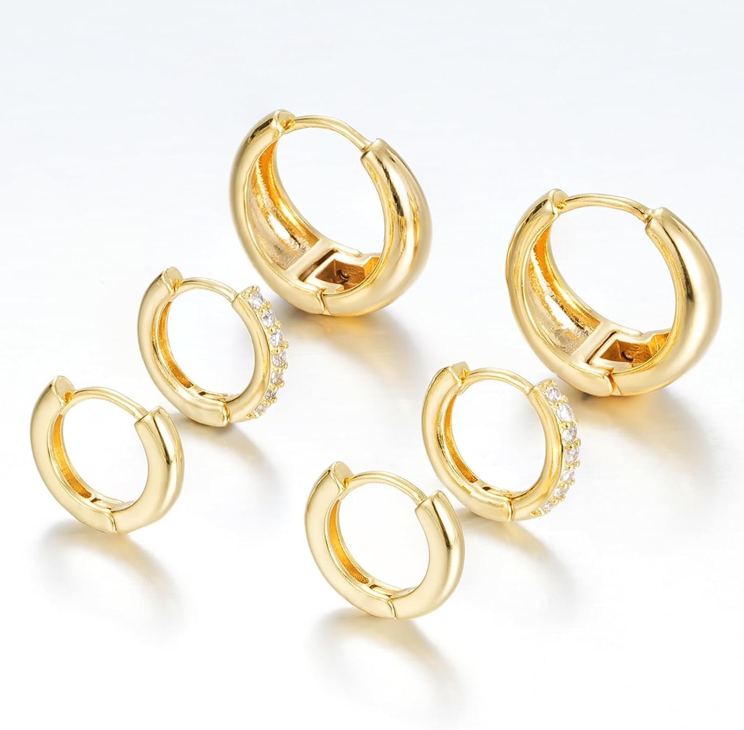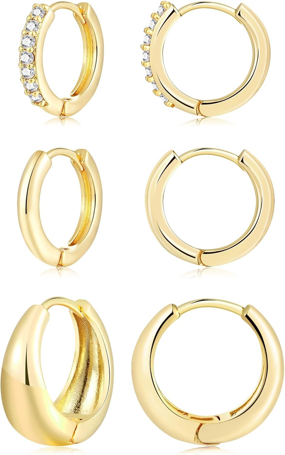 3 Pairs Gold Hoop Earrings Set for women, 14K Gold Plated Hypoallergenic Lightweight Small Huggie Earrings for Gift (3 Pairs Gold)