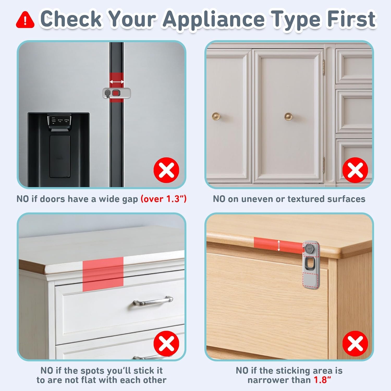 Quick Installation with No Tools: Child proof refrigerator locks are easy to install. Clean the surface, apply 3M tape, and stick. Wait 12 hours. Remove with a hairdryer or dental floss, no marks. Ideal for renters, won’t damage furniture/appliances