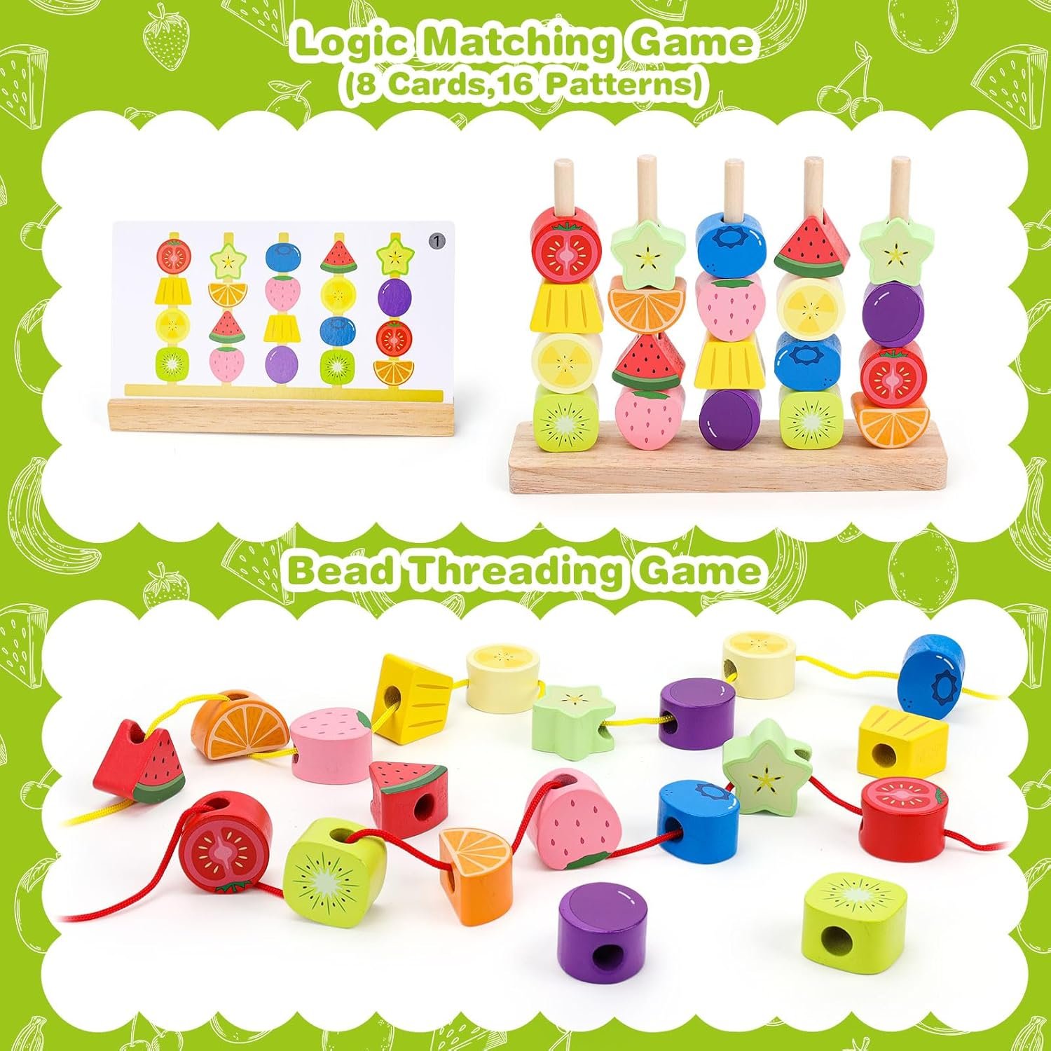 🍉 5-in-1 Developmental Powerhouse: Unlock stacking, lacing, sequencing, matching, and pattern-building with 20 vibrant beechwood beads (10 fruit, shapes), 8 double-sided challenge cards, and chunky laces. Toddlers master fruit/color/shape recognition while creating necklaces or card-matching towers. Toys for ages 2-4. Ideal for travel toys with compact storage—perfect for car seats or preschool learning activities. Outdoor toys for toddlers 1-3. Learning toys for 2 3 4 year olds.