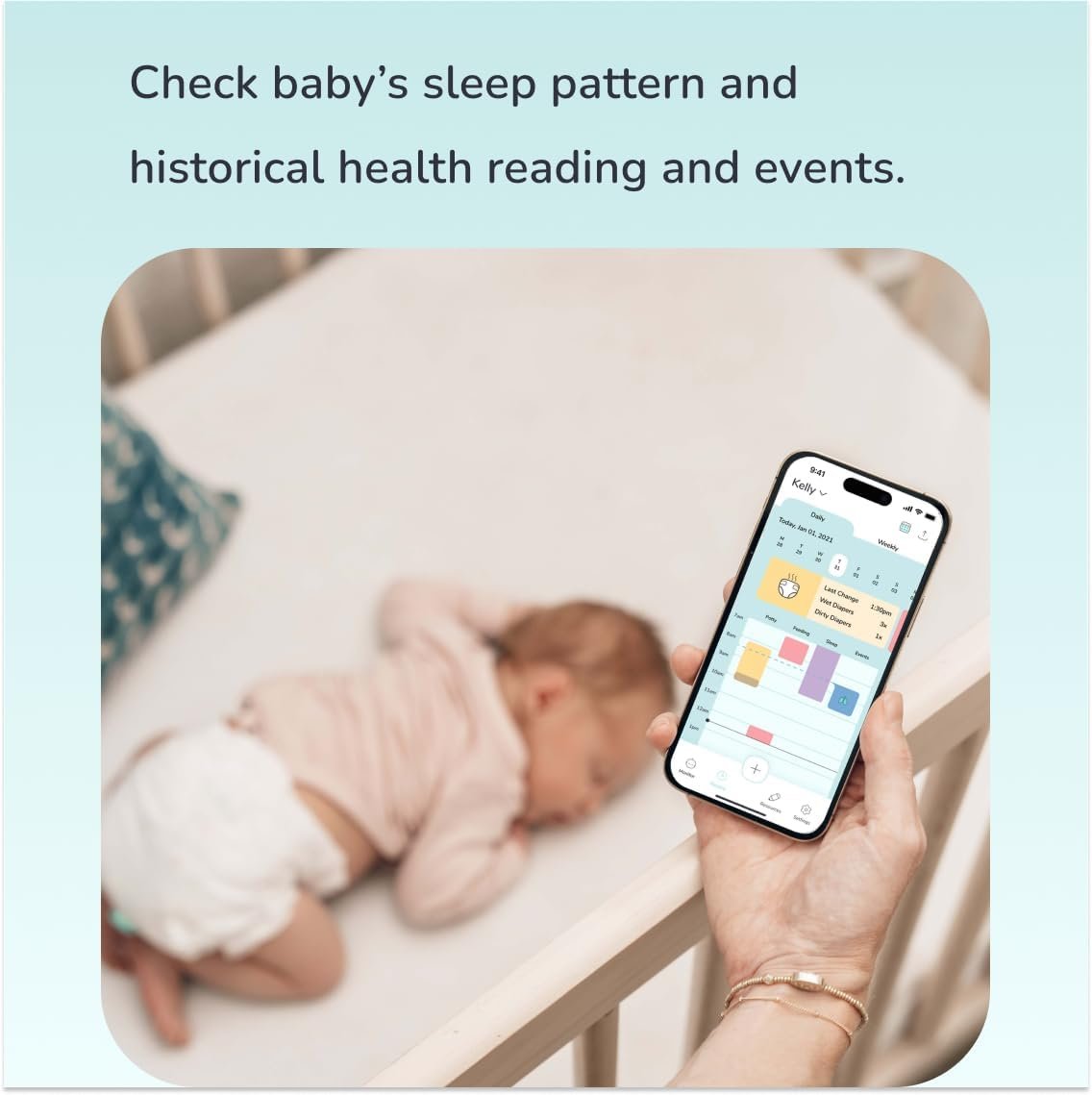 STAY INFORMED, STAY CONNECTED: Aurio keeps you deeply connected to your baby’s needs with real-time updates while recording every event. From breathing rate with abnormal alerts to sleep duration, position, rollover notifications, and wet diaper alerts, Aurio ensures you’re always informed. Designed for today’s parents, it connects to up to two phones simultaneously, giving your little one even more care and attention.