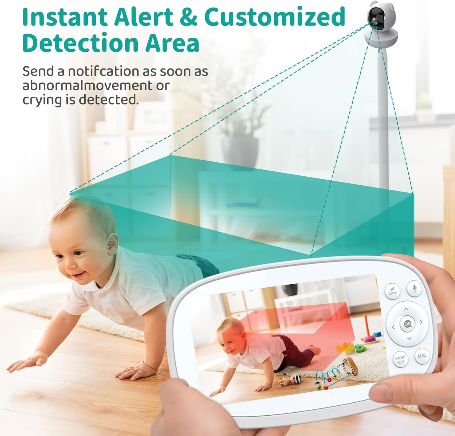 Virtual Fence Zone Seting and Alert —- This baby monitor with camera and audio supports customized detection area setting. You can preset a virtual fence for your baby’s motion range on the monitor. When your baby leave the fence range, the monitor will alert you