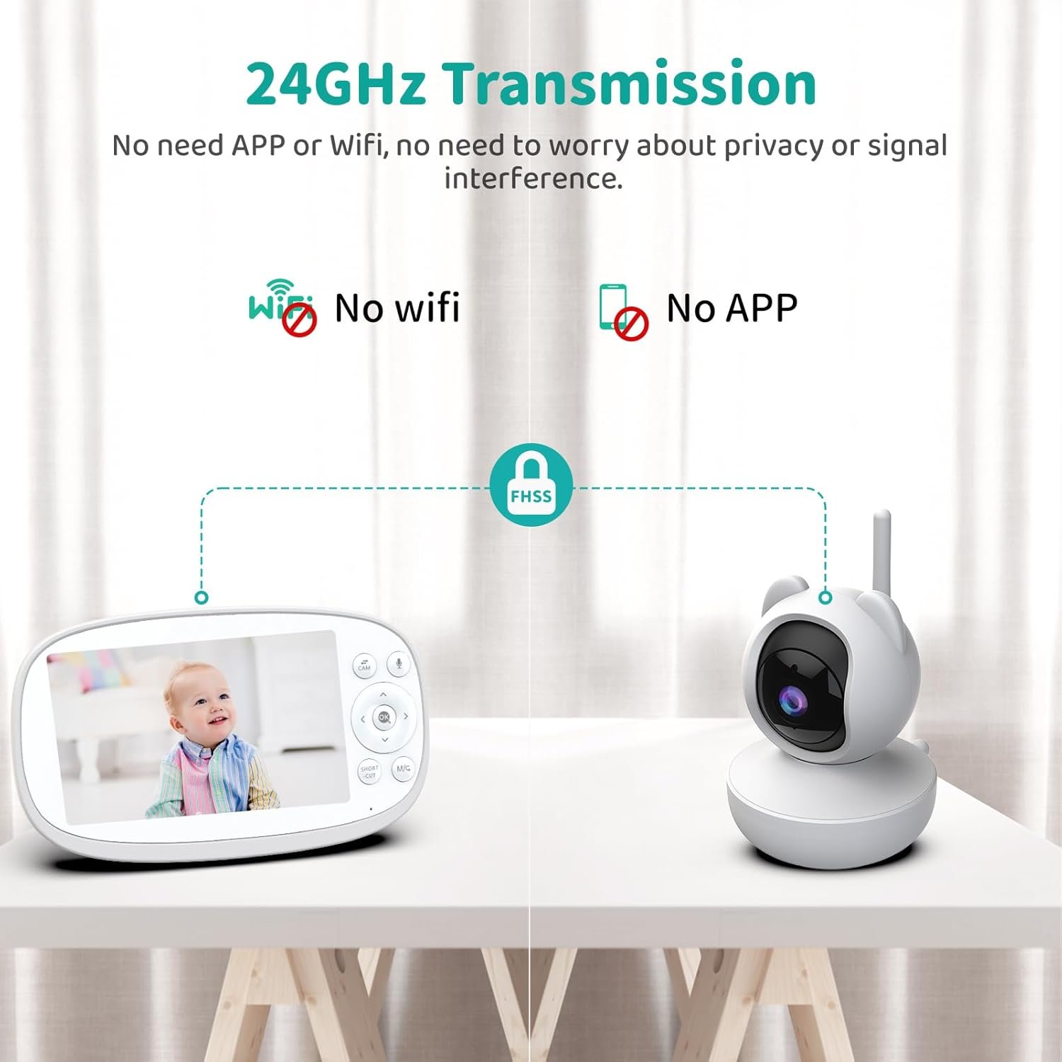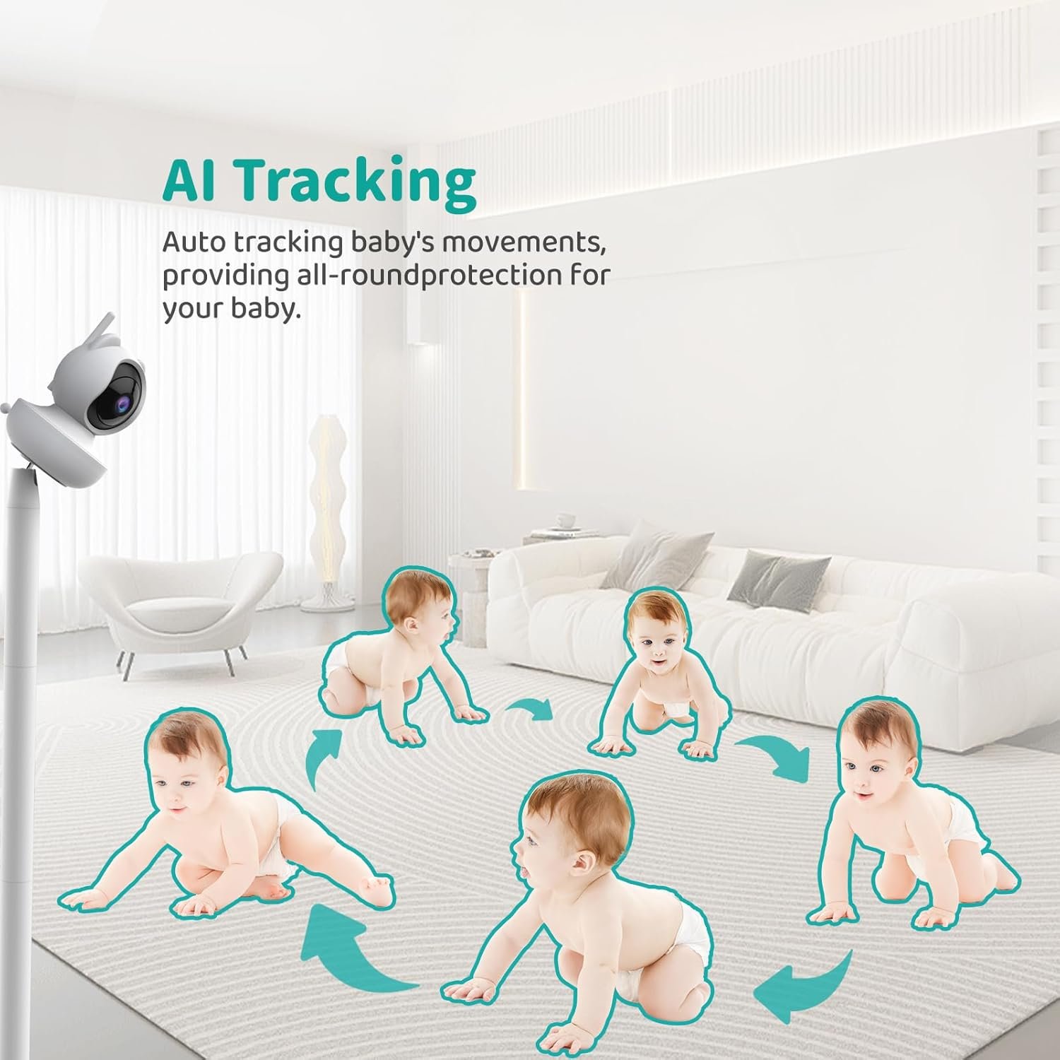 Baby’s Movement Auto Tracking —- This no wifi baby camera monitor lens pans 355° to capture all corners of a space, and tilts 110° to see floor to ceiling. When detecting baby’s movement, the video baby camera for room will automatically rotate to track the baby’s motion, which can greatly help you always pay attention to your baby’s activities