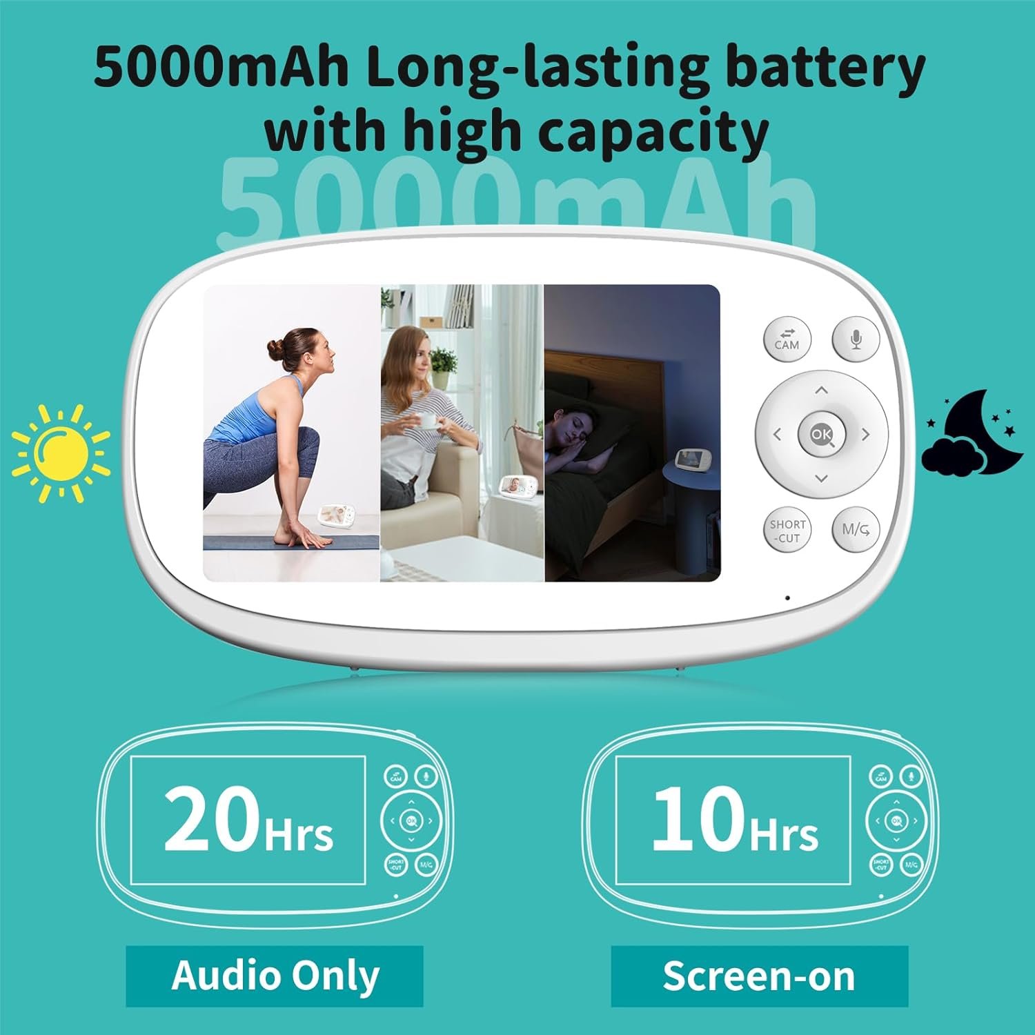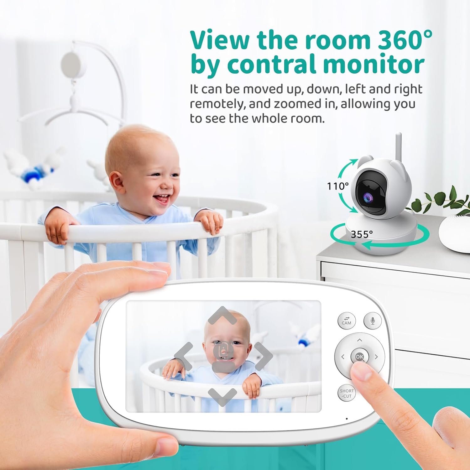 5.5 inch Baby Monitor with PTZ Camera —- VB10S baby camera supports 355° pan and 110° tilt adjustment, with the 110° viewing wide angle, this video baby monitor can bring you a much broader monitoring range from all directions. And equipped with a 5.5 inch 720P display for a clearer picture and a better view. We understand that your focus point is not merely at the middle, and hence this video baby monitor allows move the magnified scope freely and it is enlarged max 5X zoom in