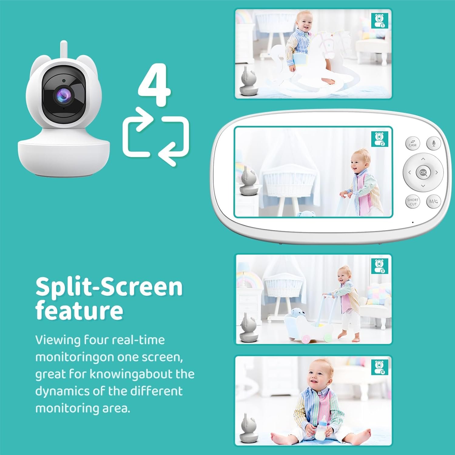 4 Split-Screen Feature —- Unlike the usual baby monitors, our VB10S video baby monitors is equipped with the 4 split-screen feature, allowing to see among cameras or babies side by side on the same screen. Therefore, you are able to see your baby’s activities in the different monitoring area instead of moving the baby camera. This baby monitor allows to connect up to 4 cameras in different rooms at the same time