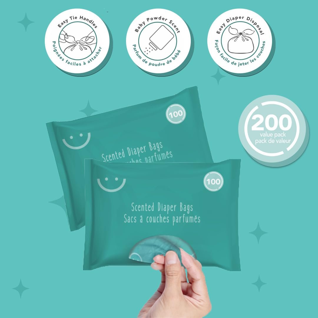 ✔️ RESEALABLE BAG FOR ADDED CONVENIENCE: These Scented Diaper Bags come in a convenient resealable back of 50ct which helps keep them fresh and clean. No more worrying while taking them in your diaper bag, purse or pocket. The zip seal is airtight to ensure they stay fresh and keep that baby powder scent! To use, simply open the zip-bag and grab a scented bag out. Place diapers, wipes, soiled clothing or other trash inside the bag and tie the handles tight.