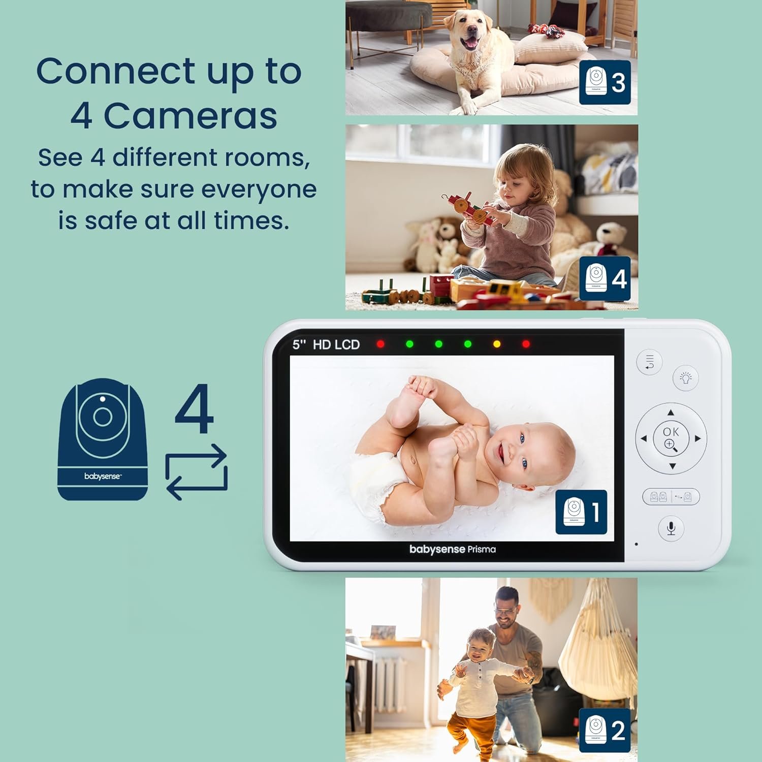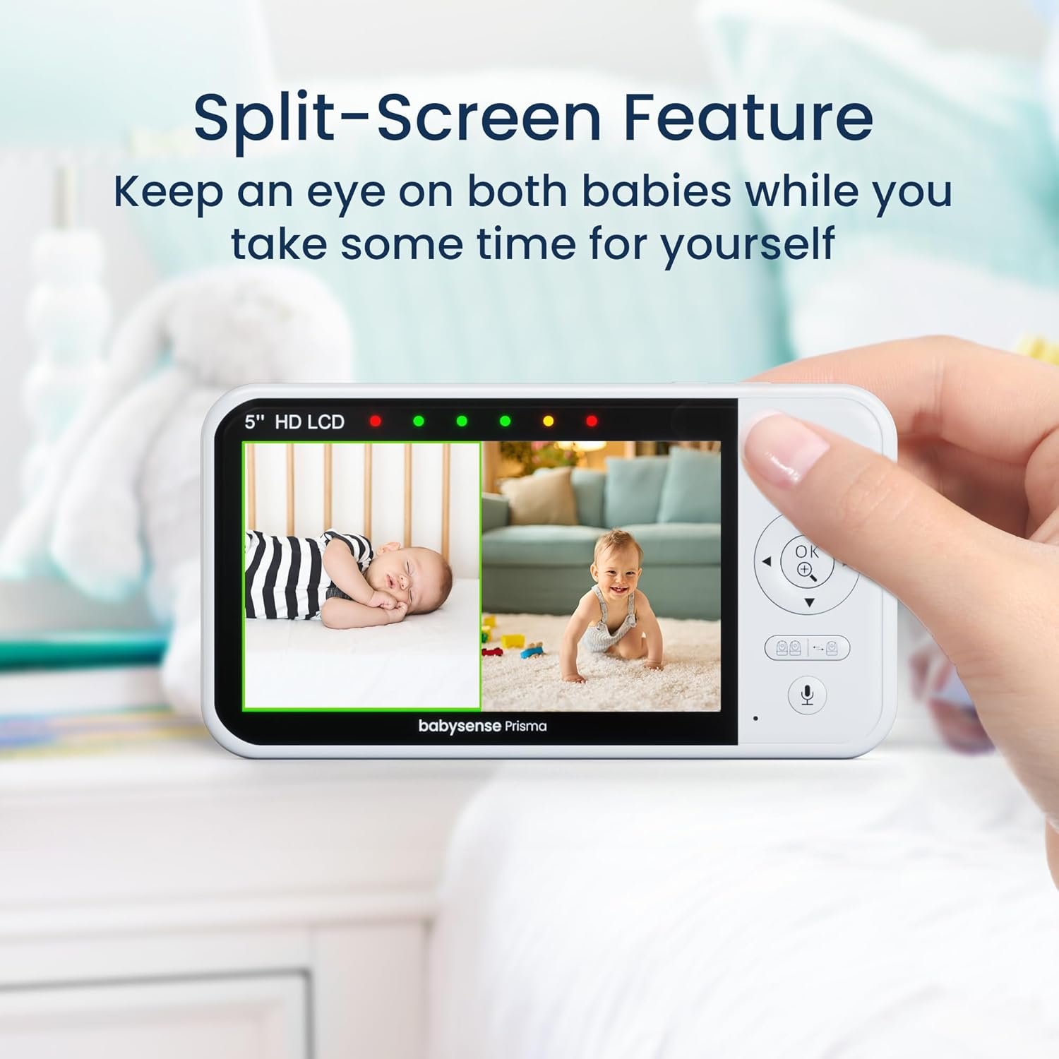 Babysense Prisma Baby Monitor with Camera and Audio, 5” HD Video Baby Monitor with 2 Cameras, 6-Color Night Light, Split Screen, Sound Machine with White Noise & Lullabies, Secure No WiFi