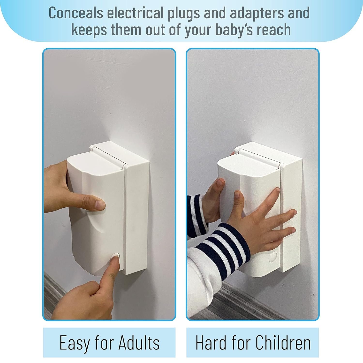 Bates baby safety outlet cover box protects curious babies, toddlers, and young children from getting to electrical outlets and plugs; the perfect solution for the bedroom, nursery, kitchen, home office, and garage.