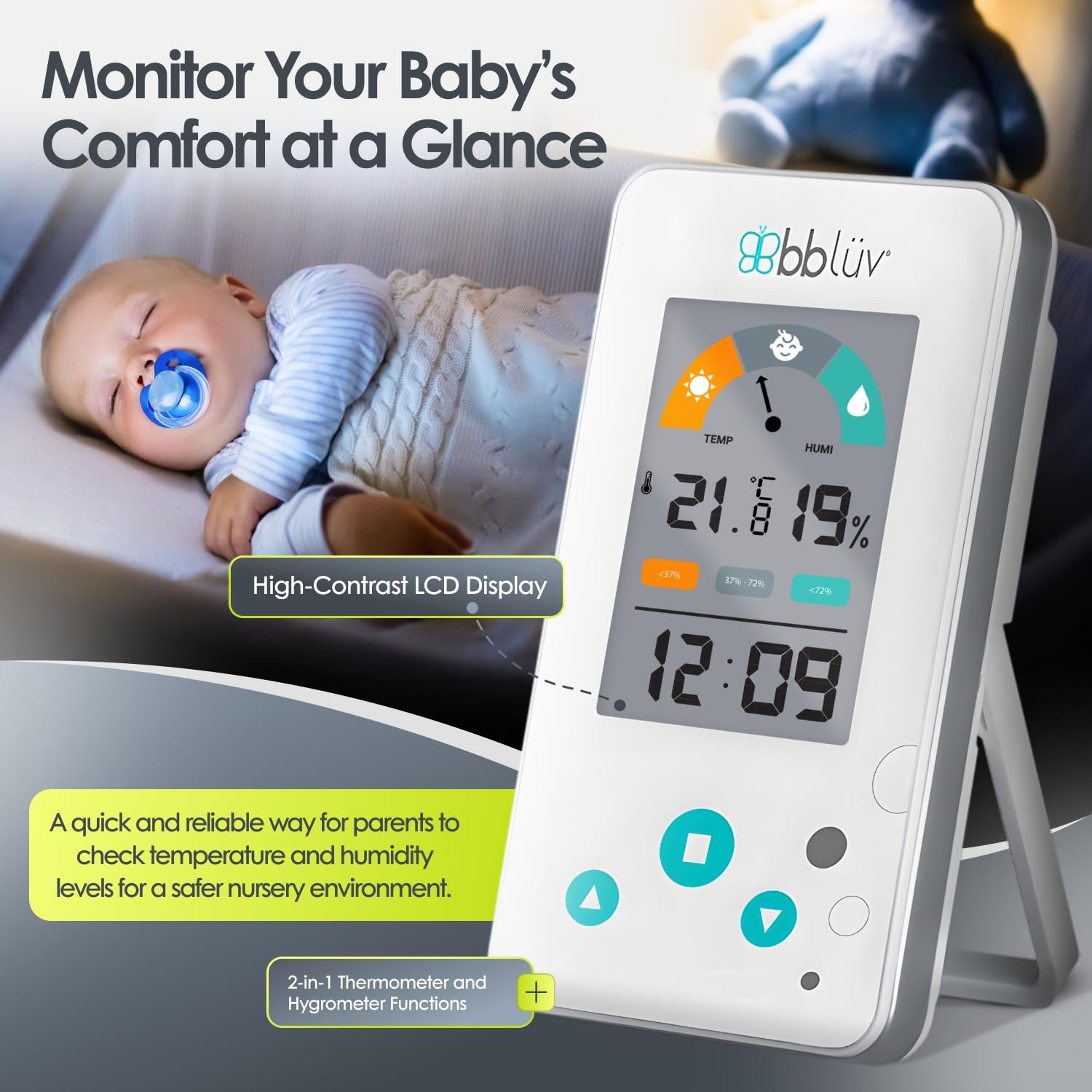 bblüv Igrö 2-in-1 | Indoor Digital Thermometer and Hygrometer | Humidity Meter for Baby Room with Alarm | Portable, User-Friendly | Ideal for Nursery, Home, or Travel