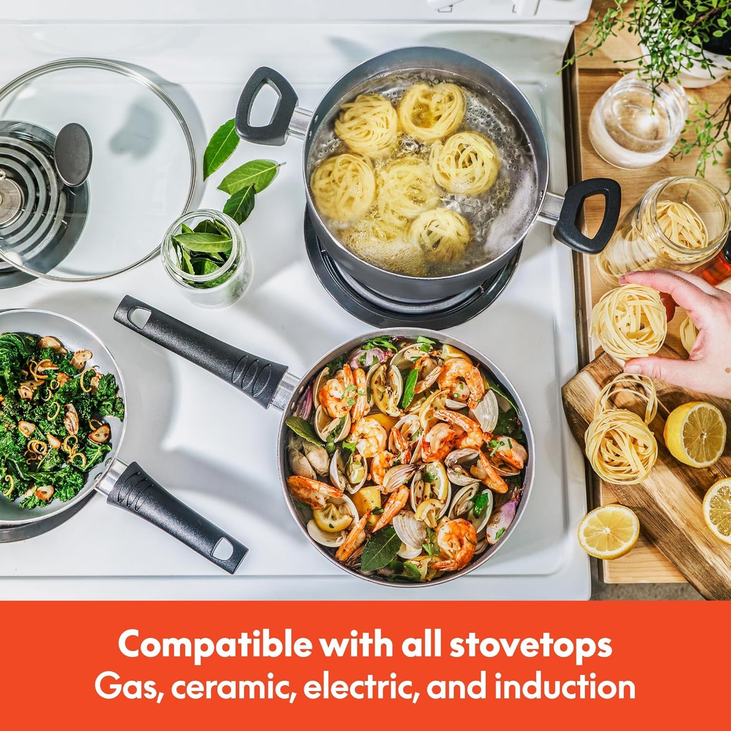 bella Cookware Set with Glass Lids with Nonstick, PFOA Free and Scratch Resistant Surface, Aluminum Bakeware, Pots and Pans, Storage Bowls & Utensils, Compatible with All Stovetops, 21 Piece, Gray