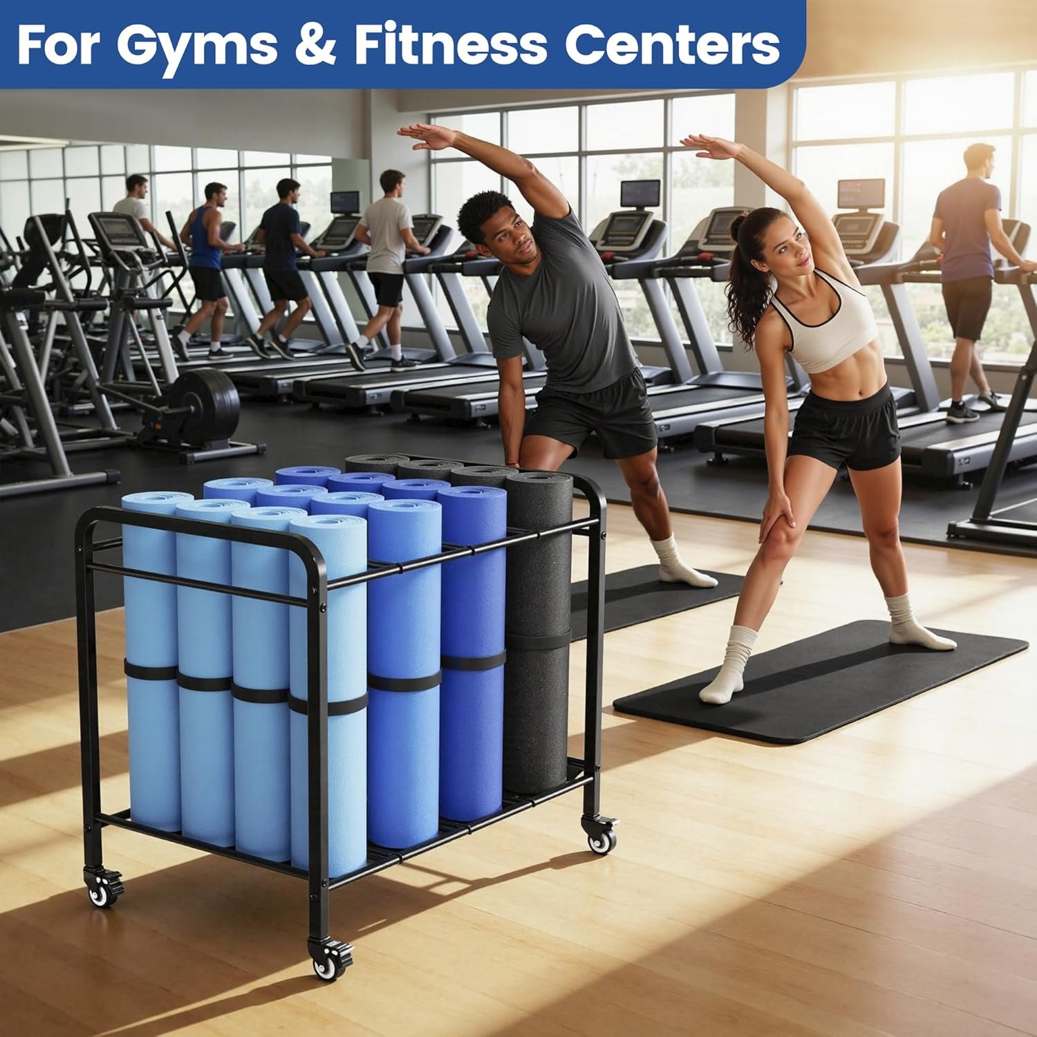 1.Designed for gyms, yoga studios, fitness classes, and high-capacity home gyms, this heavy-duty rolling yoga mat storage cart provides a clean, professional solution for organizing large numbers of yoga mats in busy workout environments.