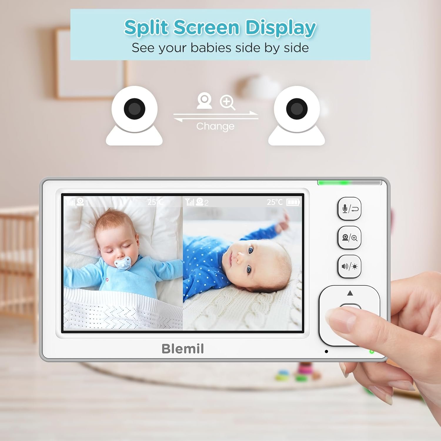 Blemil Baby Monitor with 2 Cameras and Audio, 4.3” IPS Split-Screen Monitor with 29-Hour Battery, 1000ft Range Pan-Tilt-Zoom Video Baby Monitor No WiFi, 2X Zoom
