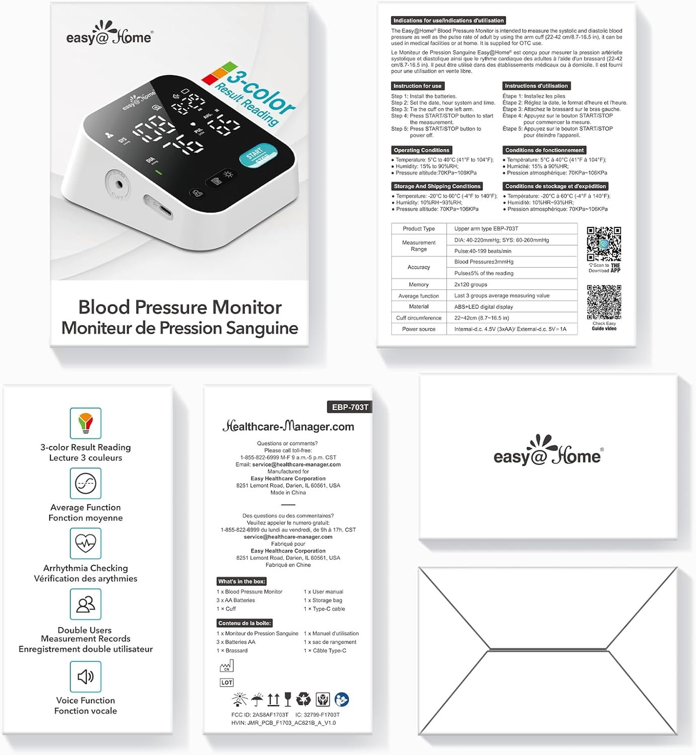 All-in-One Kit: Compact and lightweight, this complete kit is perfect for portability and travel. The package includes a Type-C charging cable, storage bag, 3 AA batteries, an instruction manual (in English and French), a wide-range cuff (8.7–16.5 inches/22-42 cm), and the clinically approved BP monitor. This all-in-one set is the perfect solution for monitoring your health anytime, anywhere.
