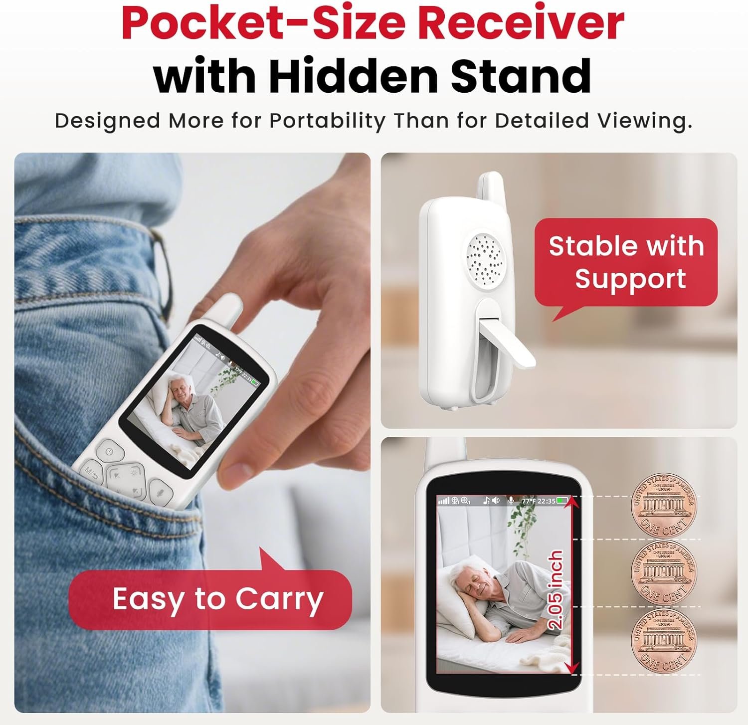 Flexible Cameras for Elderly & Portable Monitoring System – Designed for caregiver mobility, the compact receiver fits in a pocket. Paired with wide-angle cameras for elderly, it creates a flexible elderly camera monitoring system for any room. The 2.8″ screen allows quick on-the-go viewing.