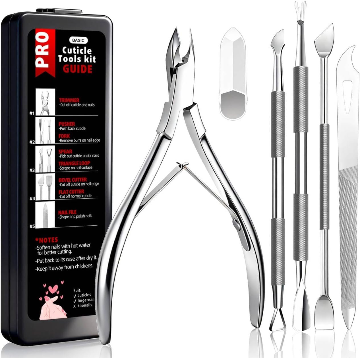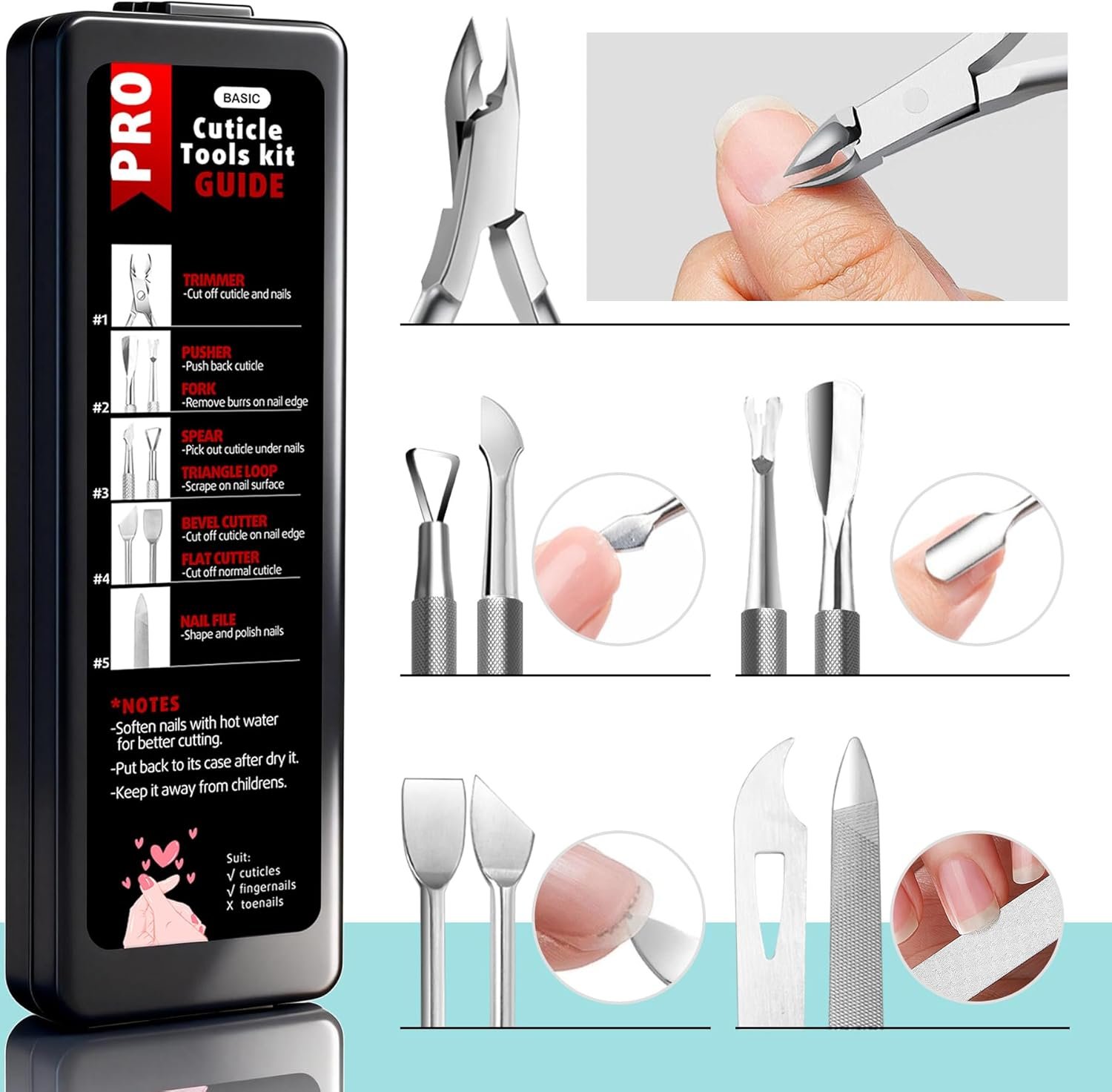 Target audience: Girls, women, teens, men, adultsSuitable for: Cuticles, fingernails & toenails, ingrown nails, sensitive nails, barbs.Wide application: Personal nail care, pro nail tech, nail learner, nail salon, travel DIY nail art and home use.Special features: Rustproof, ergonomic Handle, anti-slip handle, light weightYou will get: 5 pcs cuticle trimmer kit, 1 pcs storage case with user manual.