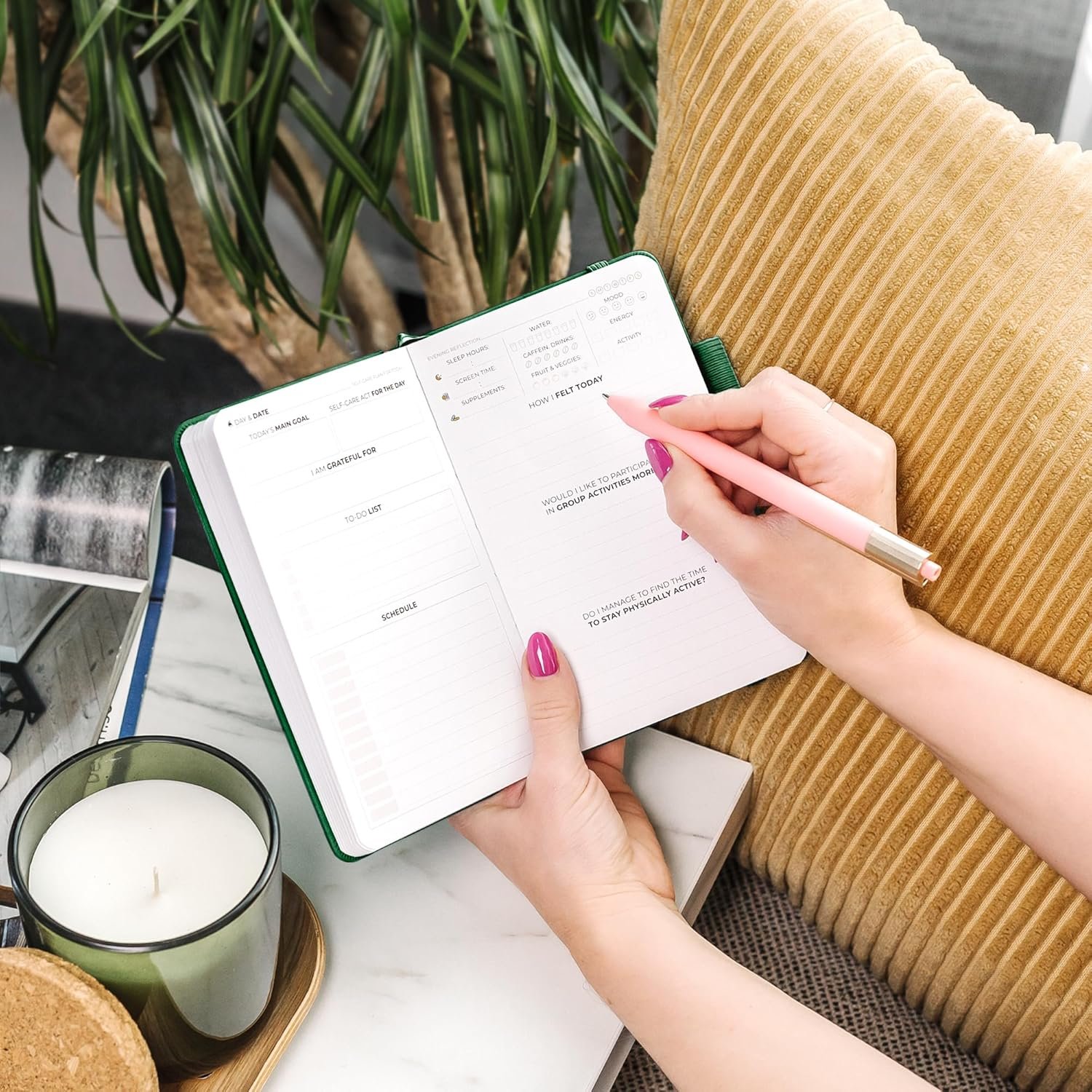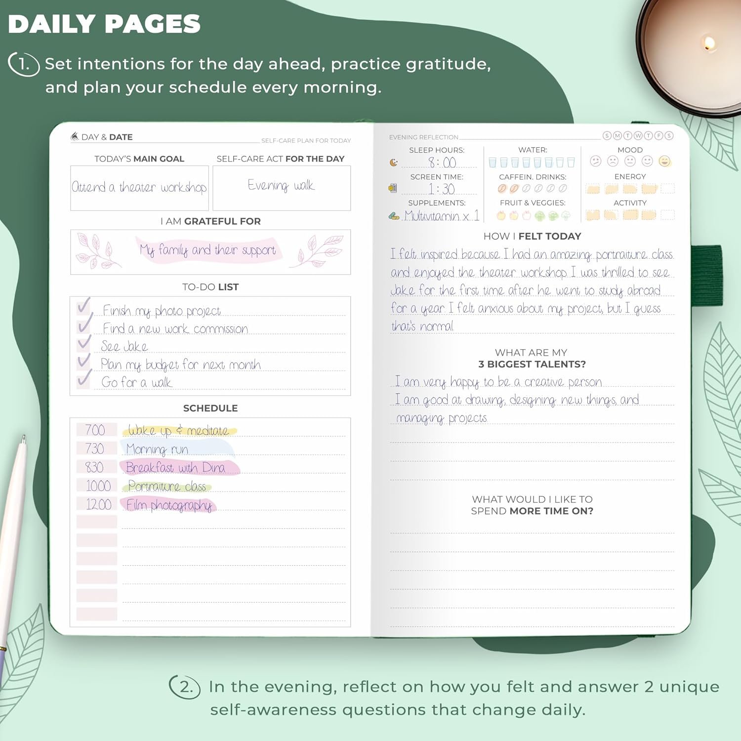 Start each day by scheduling your time, setting your main goal, self-care act of the day, and practicing affirmations. Rewind each evening with reflective questions to improve your self-awareness and track your daily wellness data.