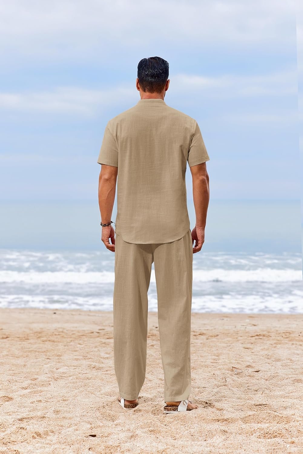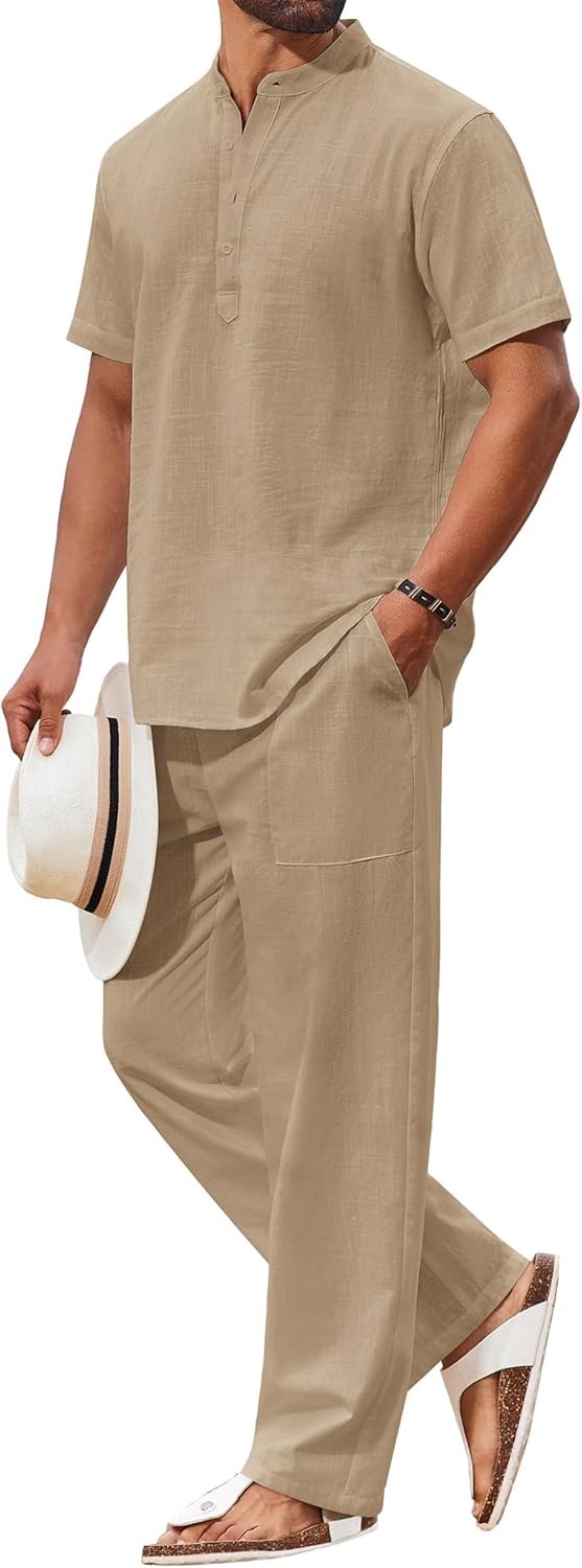 COOFANDY Men’s 2 Piece Cotton Sets Casual Short Sleeve Henley Shirts and Beach Pants with Pockets Summer Vacation Outfits