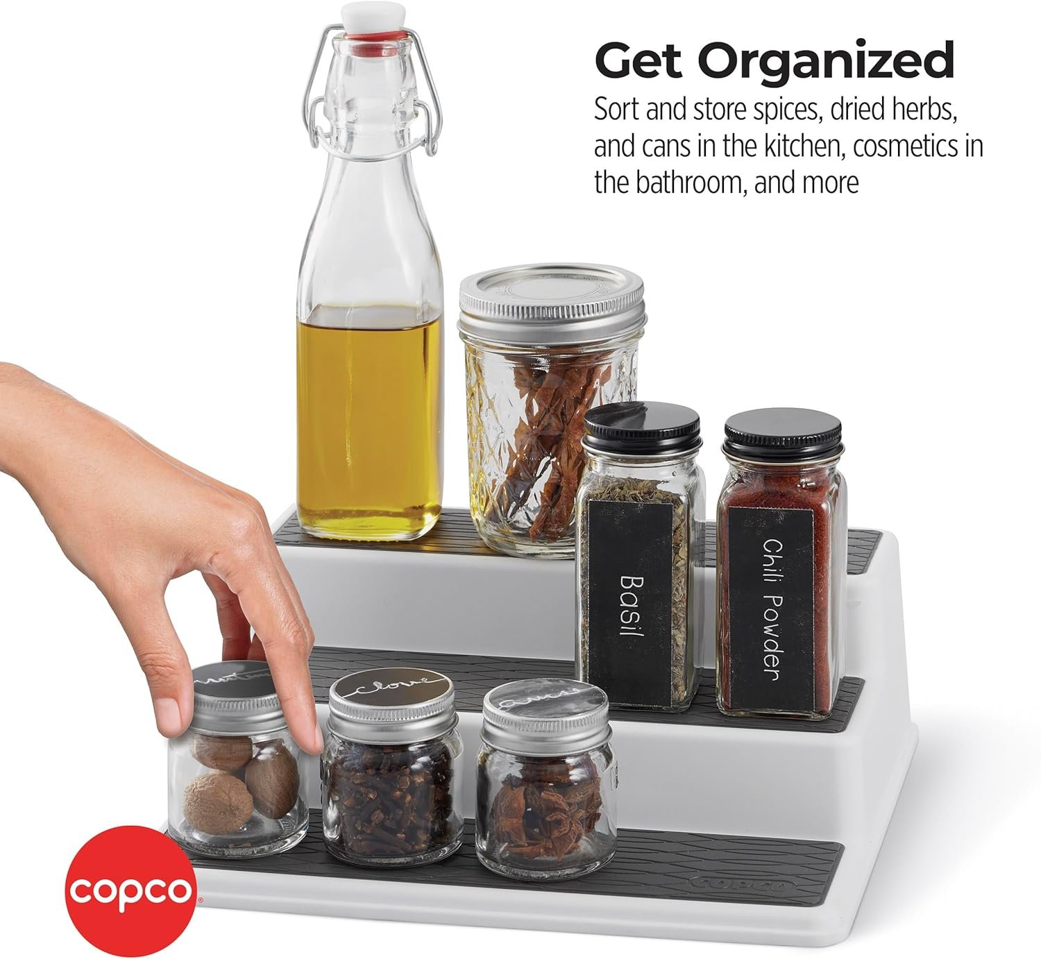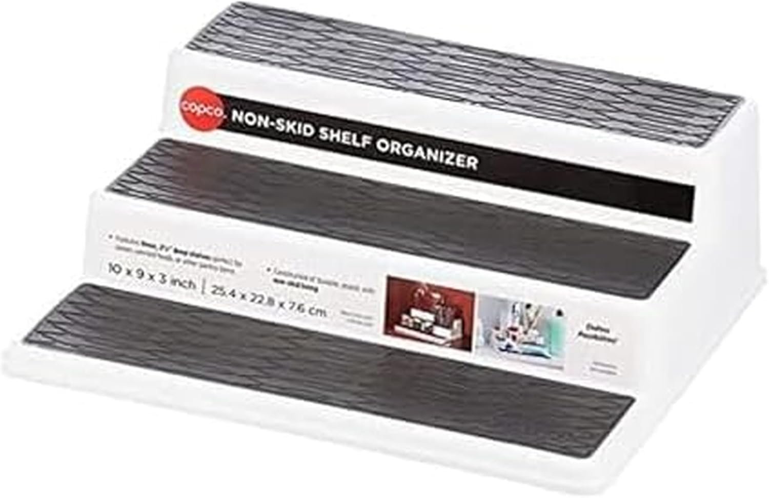 Organize your spices and pantry essentials with the Copco Non-Skid 3-Tier Spice Pantry Kitchen Cabinet Organizer. This compact 10-inch tiered rack fits neatly inside cabinets and pantries, providing easy visibility and access to your favorite spices, sauces, and small containers. Each tier features a non-skid surface to prevent slipping and tipping, ensuring your items stay securely in place while you reach for them. The sturdy design supports heavier jars and bottles, while the neutral white and gray color scheme blends seamlessly with most kitchen decors. Easy to clean and designed for long-lasting use, this organizer helps reduce countertop clutter and keeps your kitchen running smoothly and efficiently.