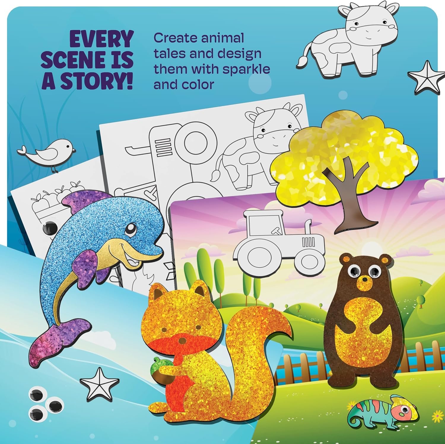 EVERY SCENE IS A STORY: Encourage storytelling and creativity as children craft unique animal tales with vibrant colors and sparkling foil.