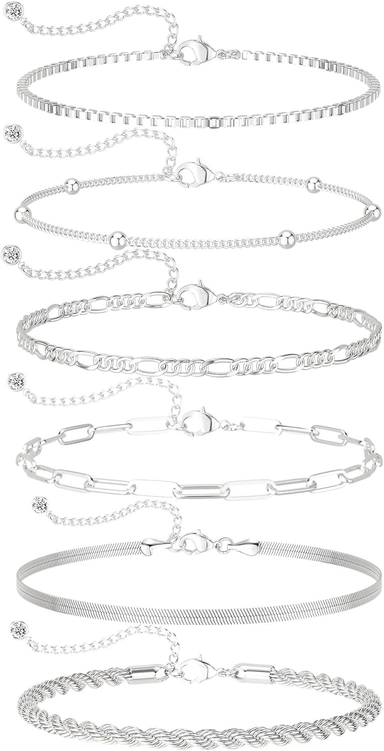 DEARMAY Dainty Silver Plated Bracelets for Women Trendy, Silver Jewelry Set for Women Bracelets for Women Paperclip Box Herringbone Figaro Rope Chain Bracelet Fashion Pack Gifts for Women