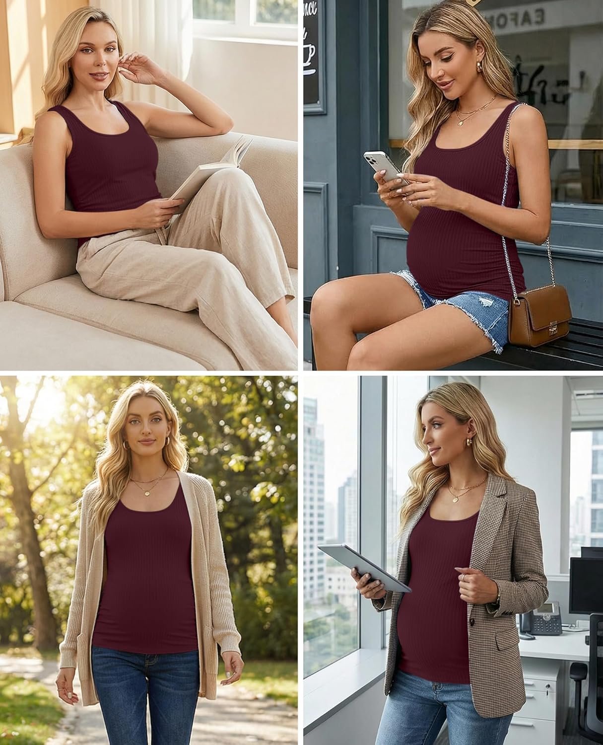 Ekouaer 4 Pack Maternity Tank Tops Ribbed Summer Pregnancy Shirts Ruch Side Tops Casual Square Neck Postpartum Clothes S-2XL