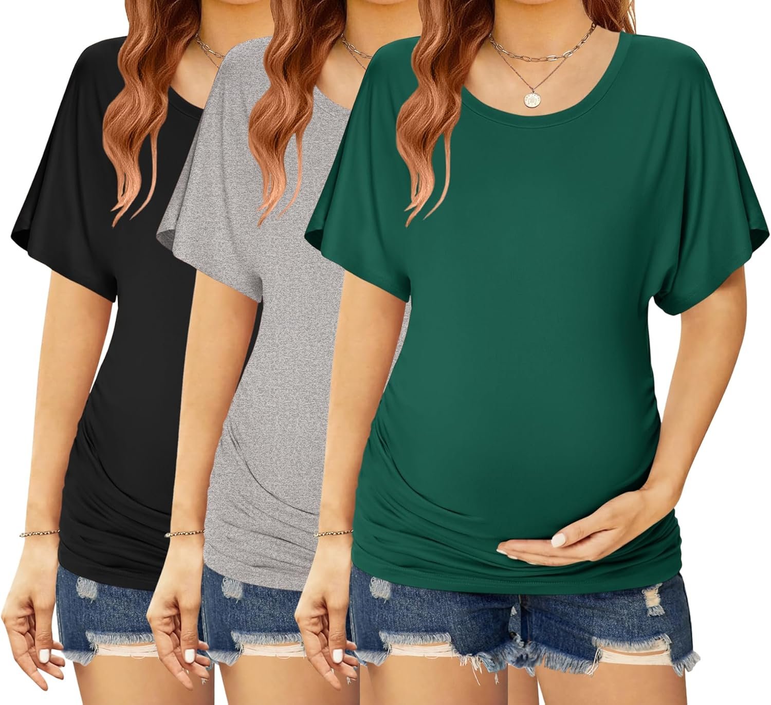 Ekouaer Maternity Shirts 3 Packs Dolman Sleeve Side Ruched Tops Tunic Casual Pregnancy Clothes S-XXL