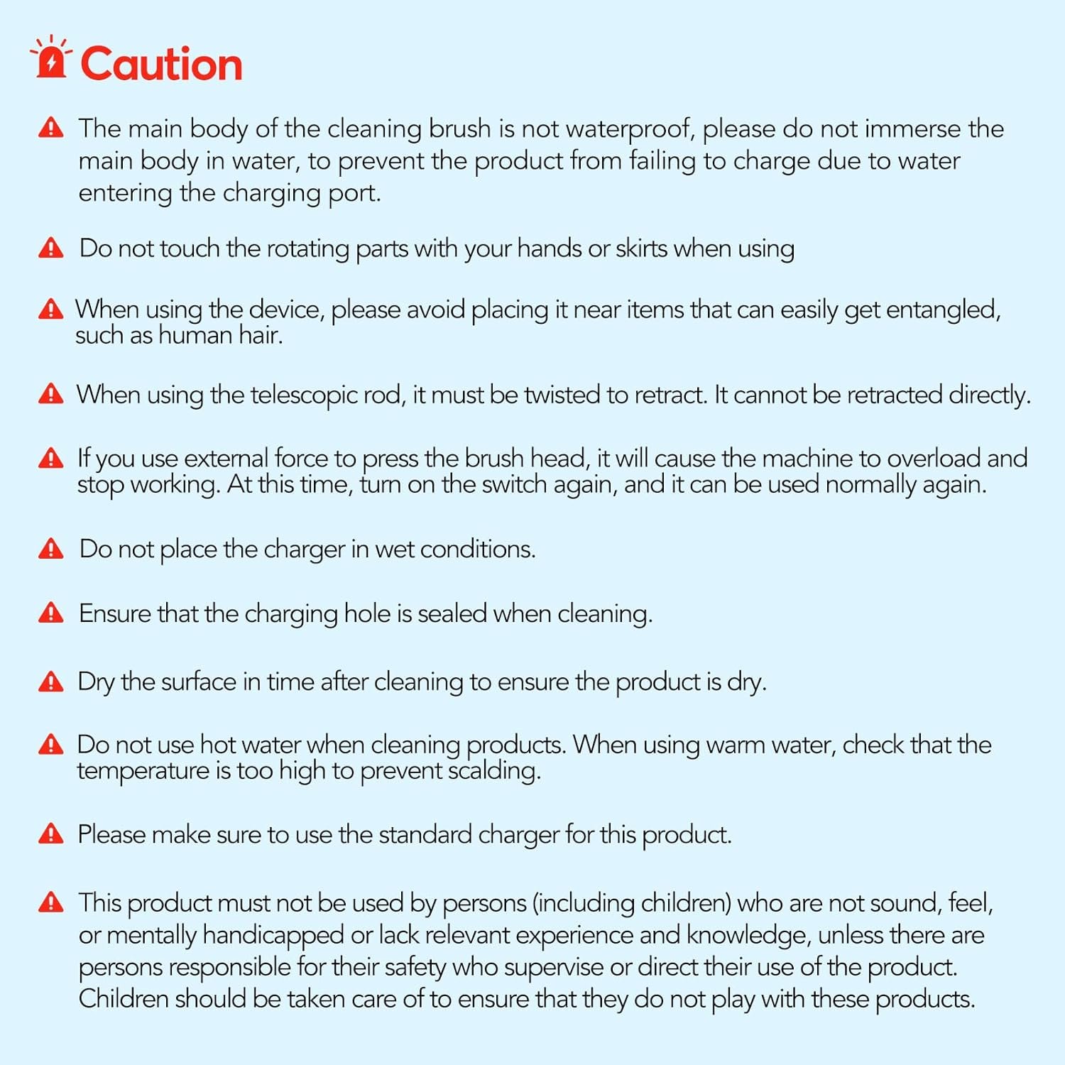 Please do not immerse the main body in water, to prevent the product from failing to charge due to water entering the charging port. Do not touch the rotating parts with your hands or skirts when using. When using the device, please avoid placing it near items that can easily get entangled, such as human hair. When using the telescopic rod, it must be twisted to retract. It cannot be retracted directly. Children should be taken care of to ensure that they do not play with the product
