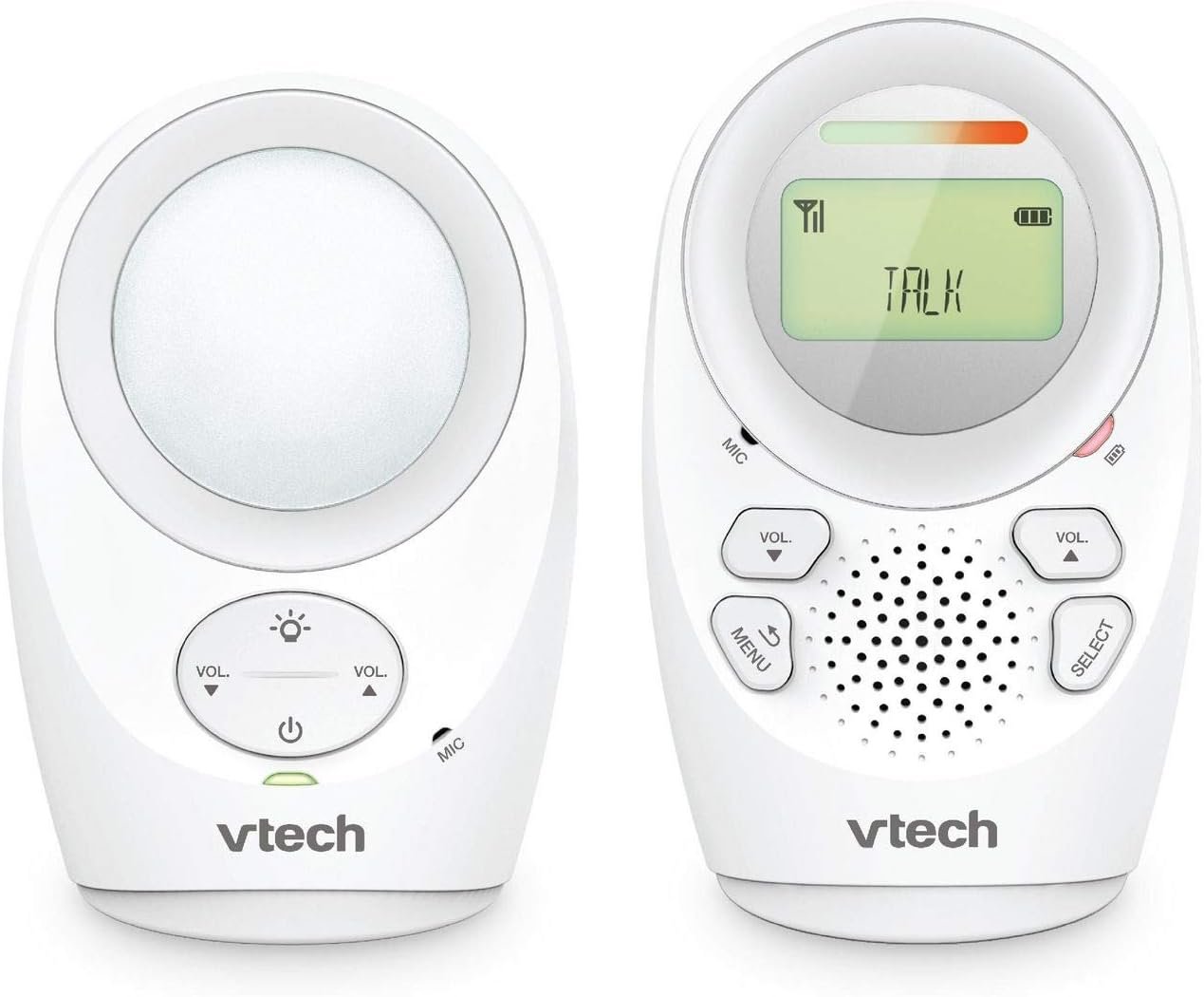 DECT 6.0 digital technology, safe digital audio transmission. Up to 0.5 m range, two-way talk back intercom. Rechargeable battery, volume control. Night light on baby unit. Vibrating 5-stage sound alarm, backlit display, low battery warning and belt clip on the parent unit
