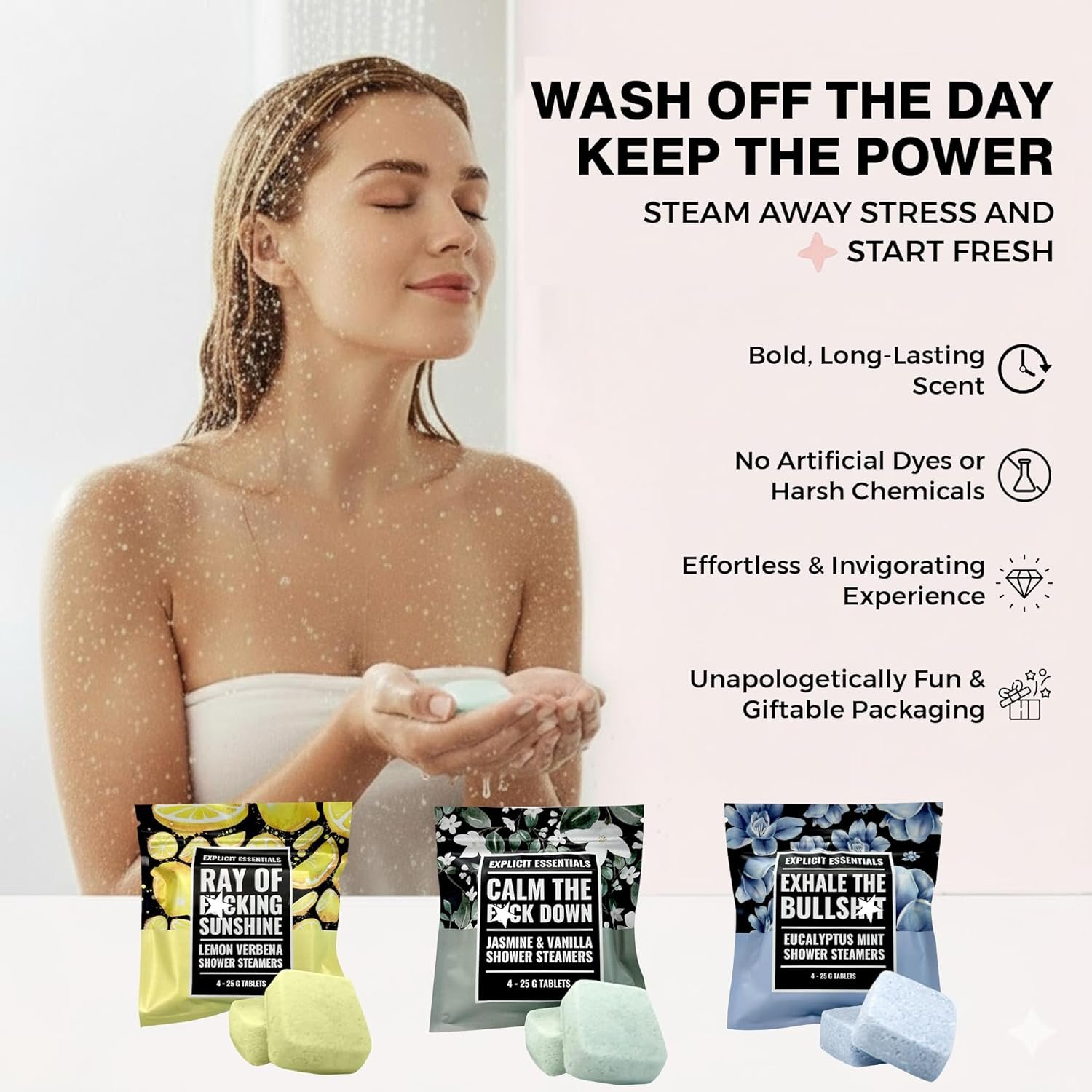 RESET YOUR ENERGY: This shower steamers gift set brings together three of our most-loved scents—Exhale The BS (Eucalyptus Mint), Calm The F Down (Jasmine Vanilla), and Ray of Sunshine (Lemon Eucalyptus) to wake you up, clear your headspace, and get you back to yourself.