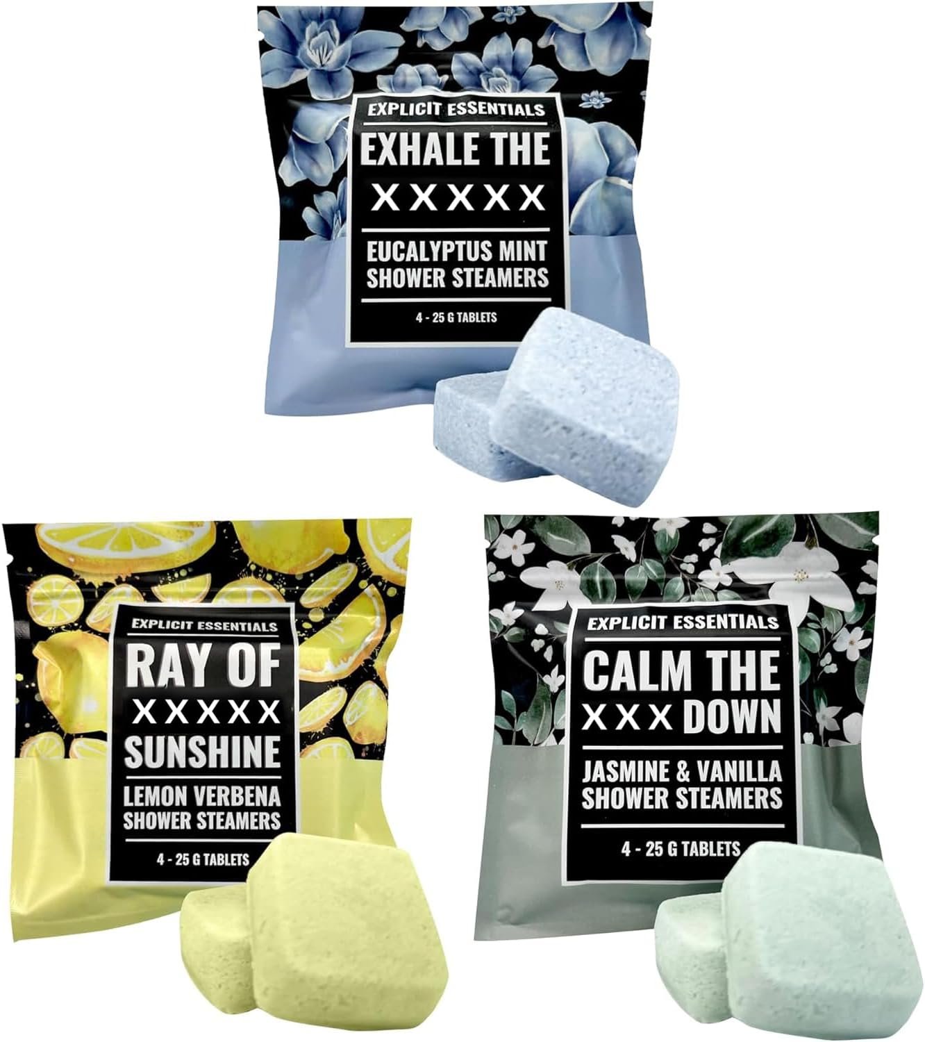 Explicit Essentials Shower Steamers Gift Set | 12 Aromatherapy Shower Steamers (3 Scent Trio) | Eucalyptus Mint, Jasmine Vanilla & Lemon Eucalyptus | Relaxation & Stress Relief Spa Gift for Self-Care