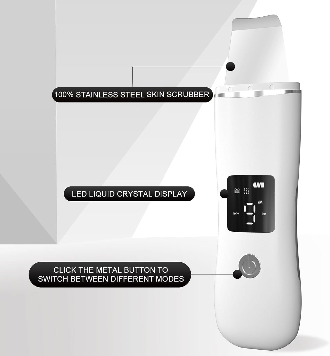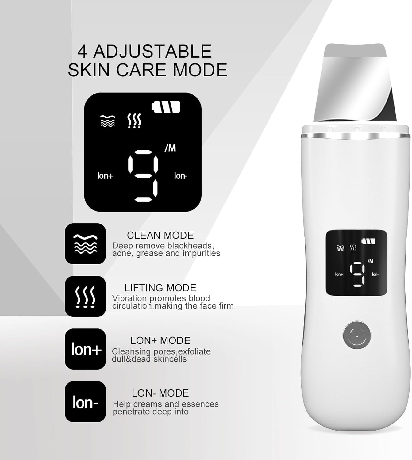 Usage Steps – Begin with “Cleaning and Ion+ mode” using a cleanser or toner for deep cleansing. Follow with “Ion-” mode to enhance the application of creams and oils. Finish with “Lifting mode” to massage and complete your skincare routine.