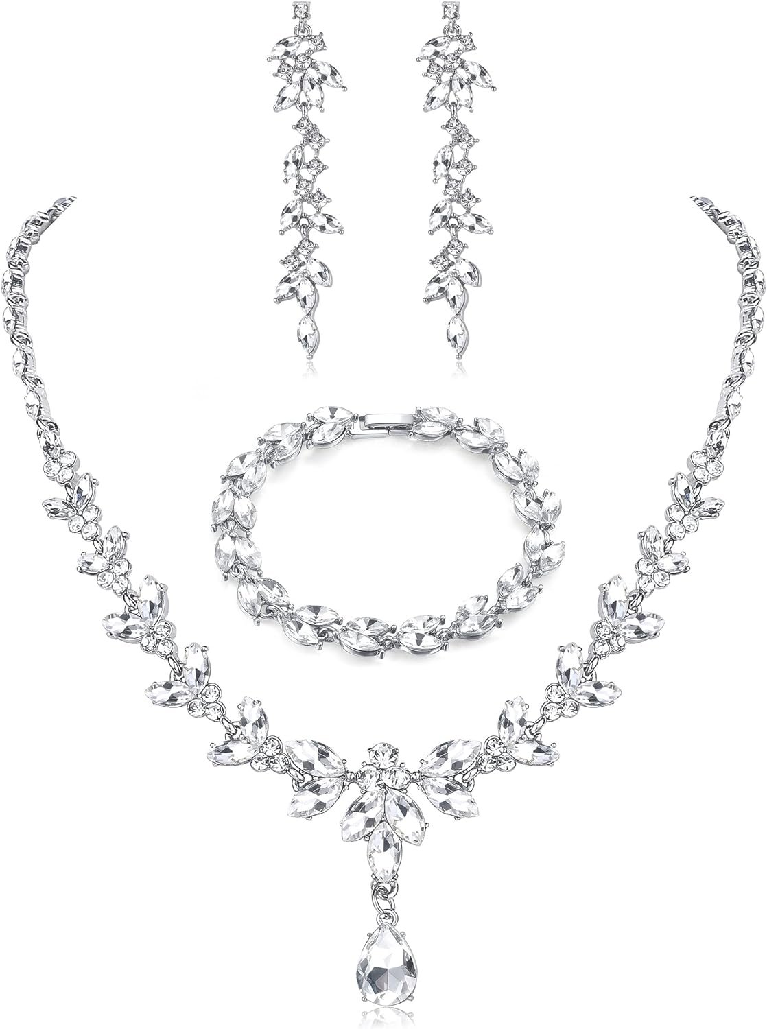 FIASASO Prom Jewelry Set Necklace Dangle Earrings Bracelet Bride Bridesmaid Crystal Bridal Jewelry Set for Wedding Rhinestone Engagement Party Prom Jewelry Set for Women