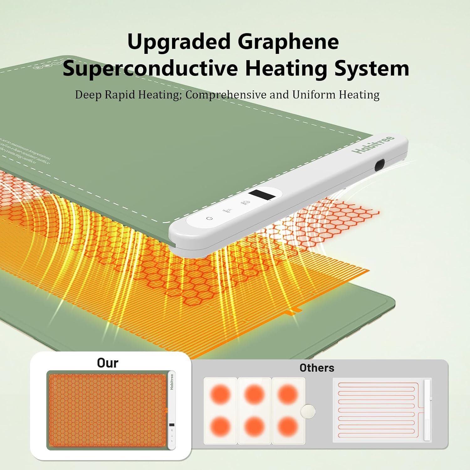 𝗛𝗜𝗚𝗛-𝗘𝗙𝗙𝗜𝗖𝗜𝗘𝗡𝗖𝗬 𝗥𝗔𝗣𝗜𝗗 𝗛𝗘𝗔𝗧𝗜𝗡𝗚 Graphene superconductor system ensures fast, even heating across the entire surface, outperforming traditional heating systems and reducing preheating time. The dimensional size of Habitree heating pad for food is 23.6×14.6inches with a heating area of 20.5×12.8inches