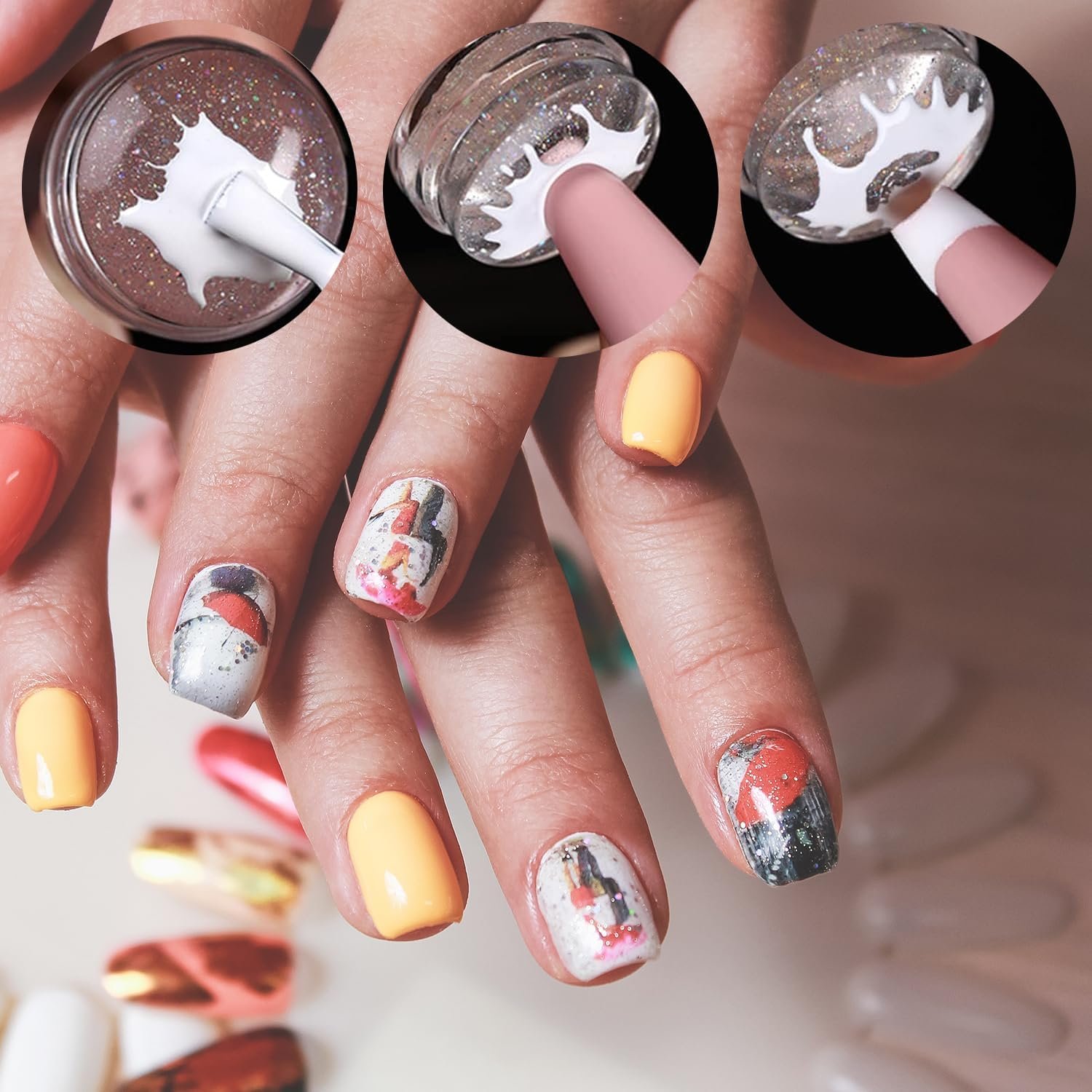 Easy to Use:In use nail stamp,first brush nail polish glue on the silicone top,then press the tip of your nail into the bouncy silicone cushion at a 45 degree angle