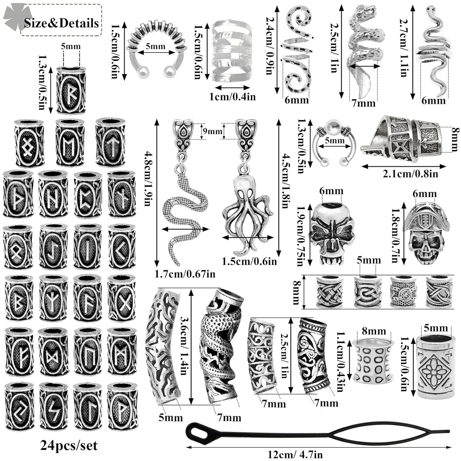 Suitable Size:The smooth Viking accessories are perfectly sized for your beard and braids,and the boxed braid accessory set comes with a variety of beads in various diameters that are perfect for sliding through your hair.The norse bead designs are simple and basic enough to complement any other beard beads or jewelry you wish to pair with them.