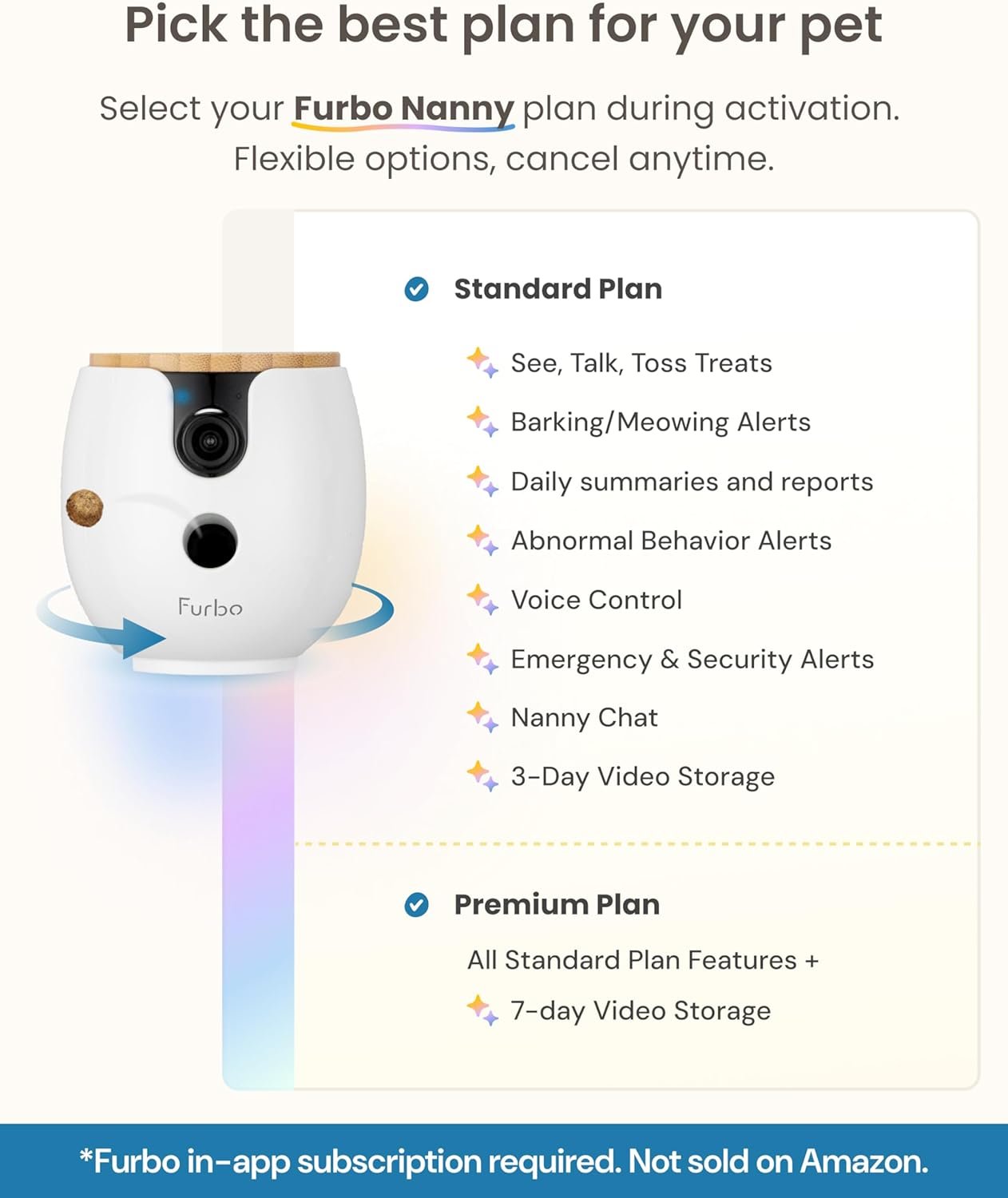 FURBO NANNY MEMBERSHIP: An additional paid subscription is required to activate your camera. Flexible plans available. Low risk, cancel anytime. Standard Plan: $6.99/mo (billed annually) or $9.99/mo (billed monthly, 3-mo minimum). If you choose to cancel, core camera functions like live view & auto tracking, 2-way audio, treat tossing, and barking or meowing alerts will remain active. Disclaimer: This model does not offer a free trial and requires a subscription.