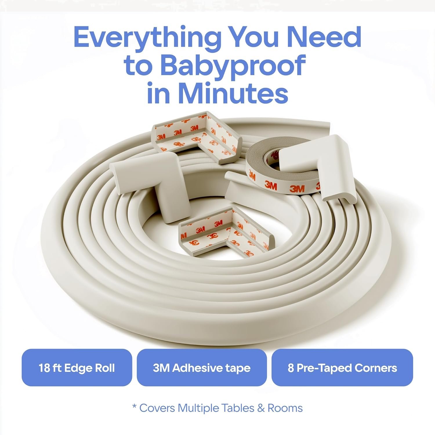 Furniture Edge and Corner Guards | 20.4ft Protective Foam Cushion | 18ft Bumper 8 Adhesive Childsafe Corners | Baby Child Proofing Set NonToxic and Safe for Table, Fireplace, Countertop | White