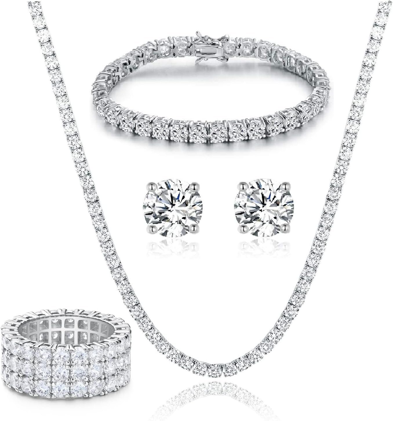 Gemsme 18K Yellow Gold Plated Tennis Necklace/Bracelet/Earrings/3 Row Ring Sets Pack of 4