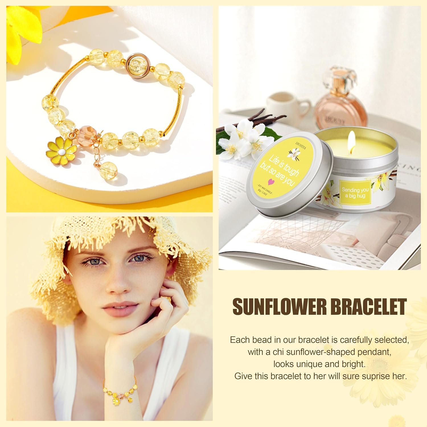 LUCOTIYA Birthday Gifts for Women-Each set comes with: Body Butter,Hand Cream, Bath Bomb, Handmade Bath Soap, Bath Salts,Scented Candles, Sunflower Bracelet, and A cup of Sunshine Glass.Sweet with vanilla and sheer floral aroma that can offer a wonderful spa experience after a long day or night.The tumbler is perfect for enjoying tea or coffee on the go, making this gifts box practical as well as luxurious.