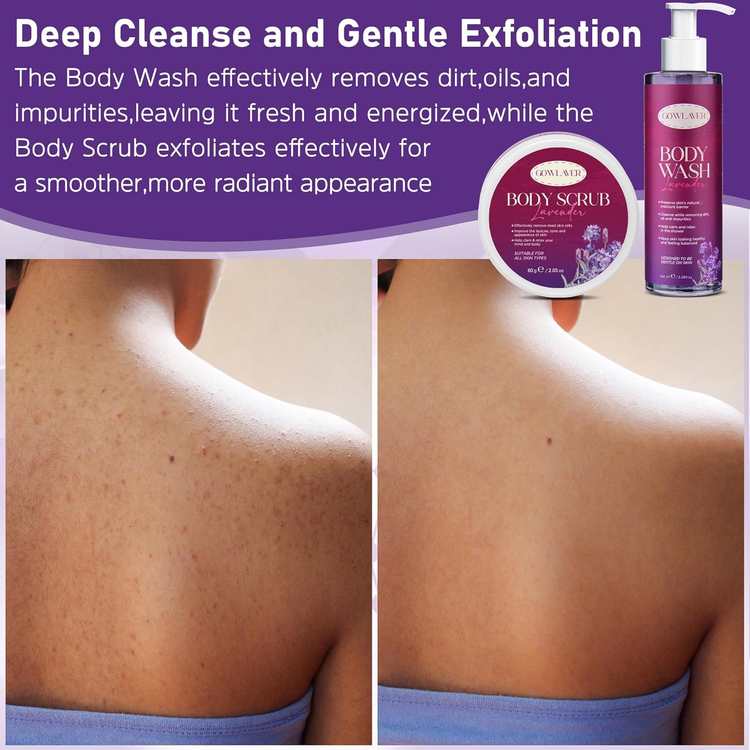 Deep Cleanse and Gentle Exfoliation:The Body Wash effectively removes dirt,oils,and impurities,leaving it fresh and energized,while the Body Scrub exfoliates effectively for a smoother,more radiant appearance