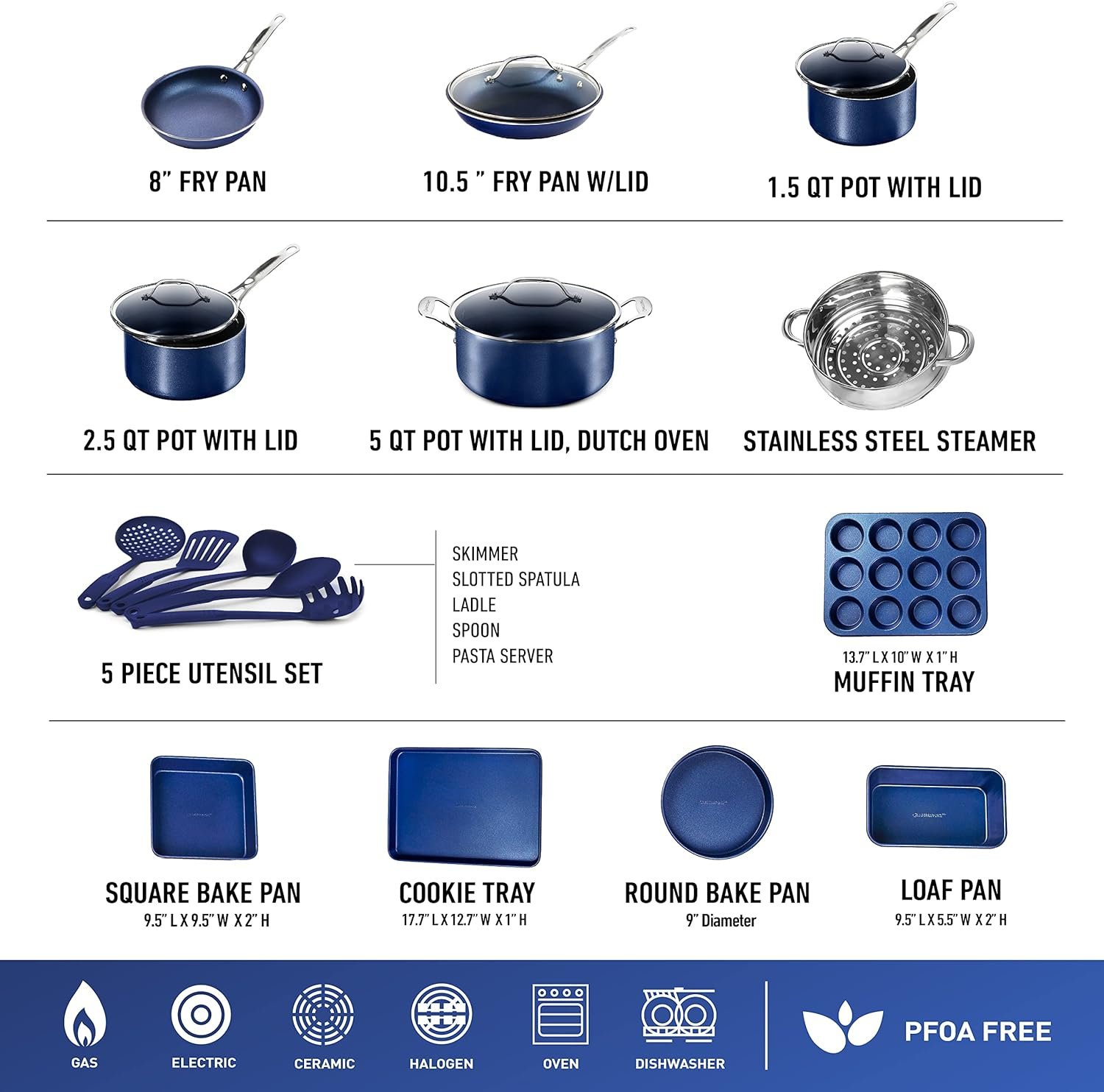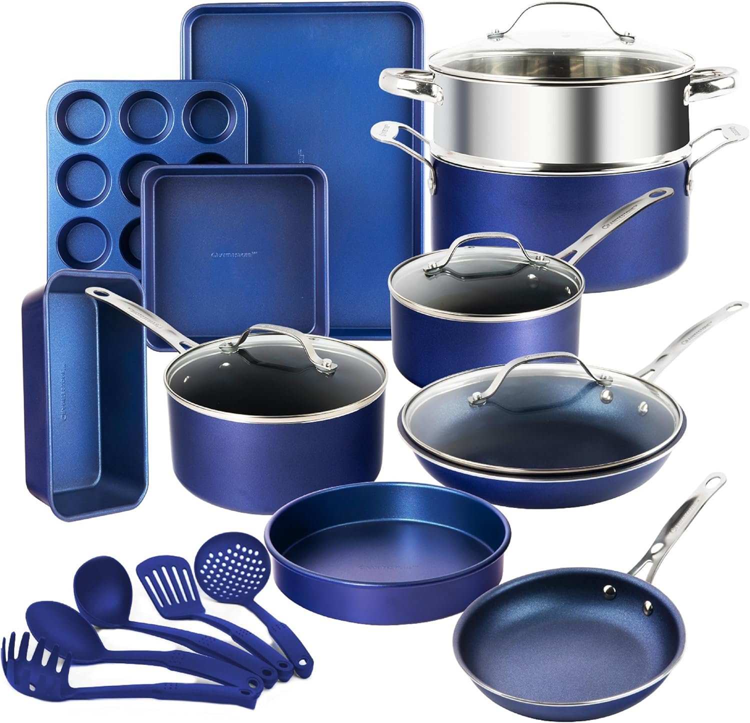 GRANITESTONE Blue 20 Pc Pots and Pans Set Non Stick Cookware Set, Kitchen Cookware Sets with Utensils and Bakeware, Non Toxic Cookware Set PFOA PFOS Free, Oven & Dishwasher Safe