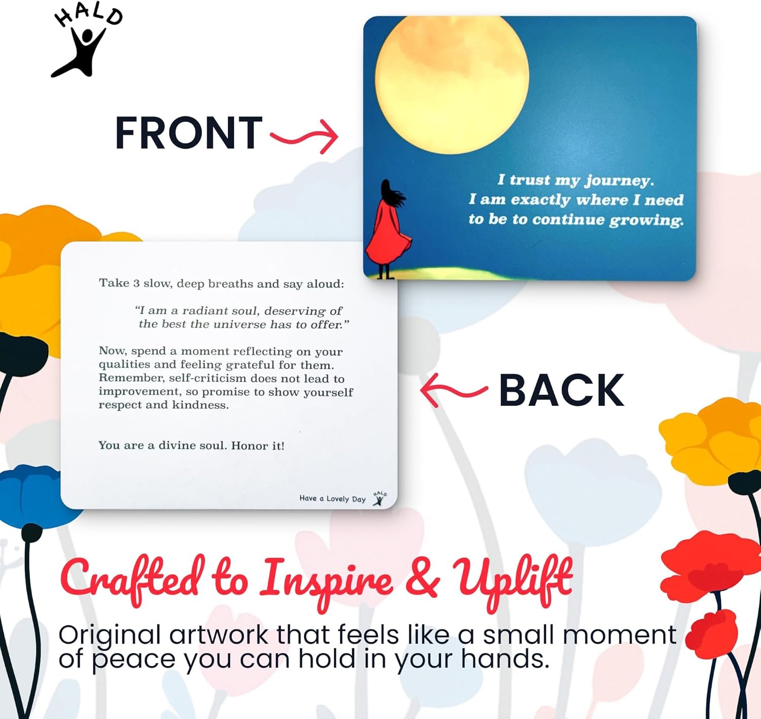HALD Positive Affirmation Cards with Mindfulness Exercises, Inspirational Tools for Everyone, Motivational Items, Self Care Gifts for Women, Men & the Youth, 60 Transformative Affirmation Cards