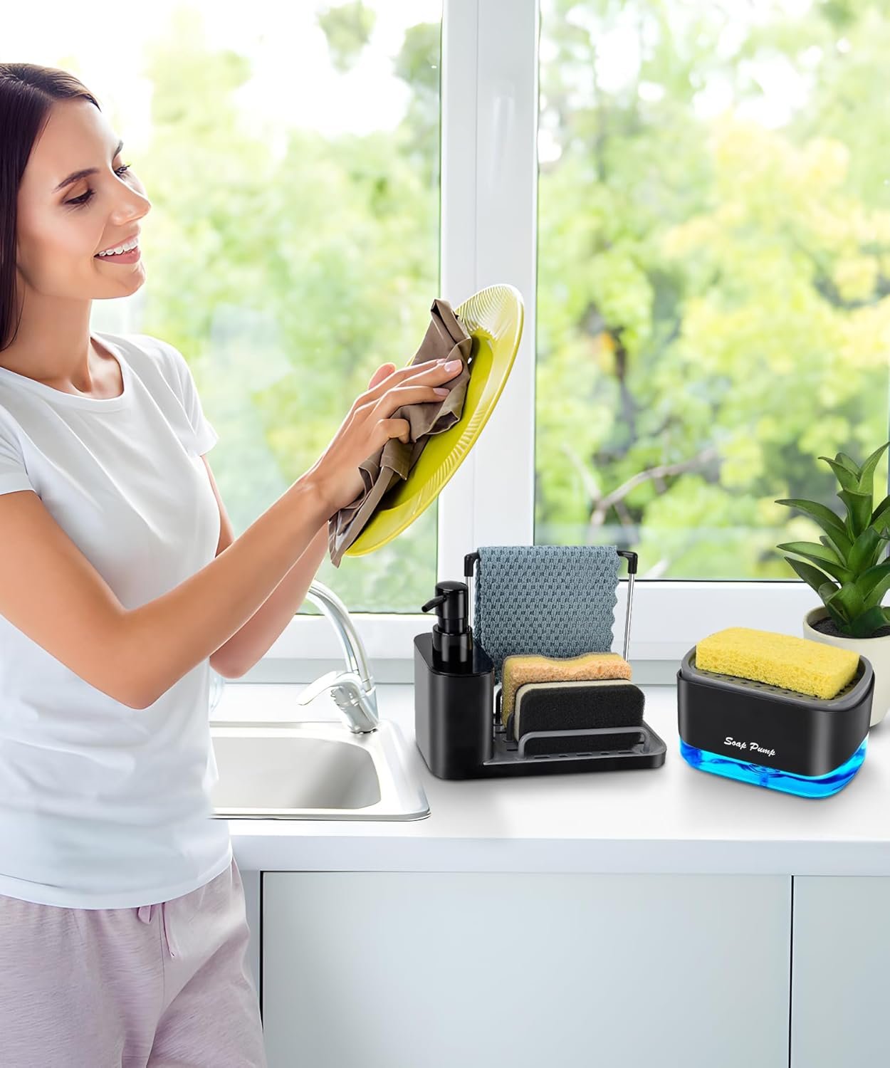 Hand and Dish Soap Dispenser Set with Tray, Dual Soap Dispenser with Sponge Holder and Dishcloth Holder 5-in-1 Organizer for Kitchen Sink Countertop Storage Organize – Useful Kitchen Gadgets (Black)