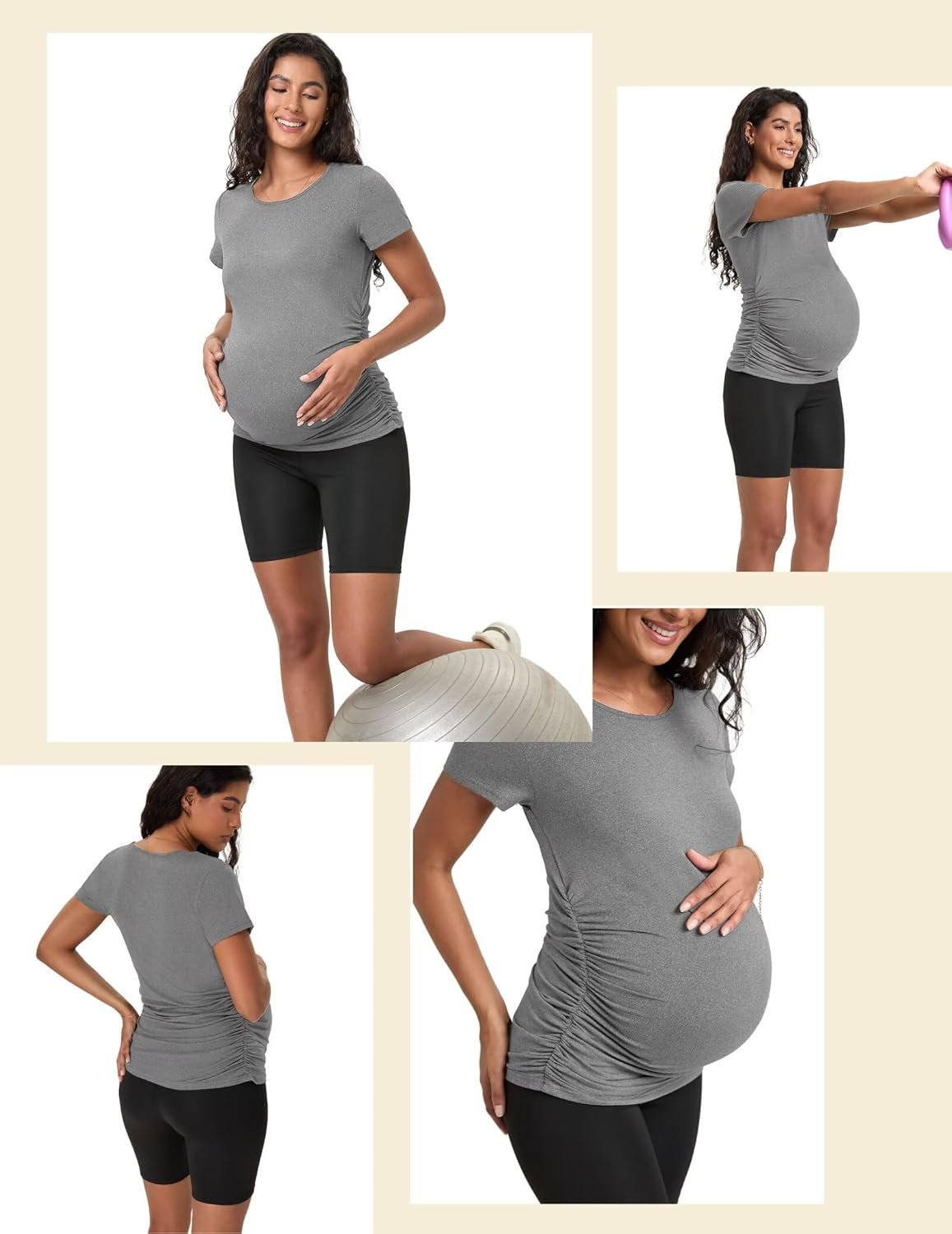 Happy.angel Maternity Shirts Short Sleeves Women’s Pregnancy Top Tees Crew Neck Side Ruched Tunic Blouses Summer Clothes