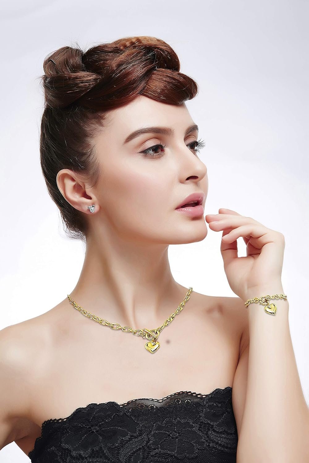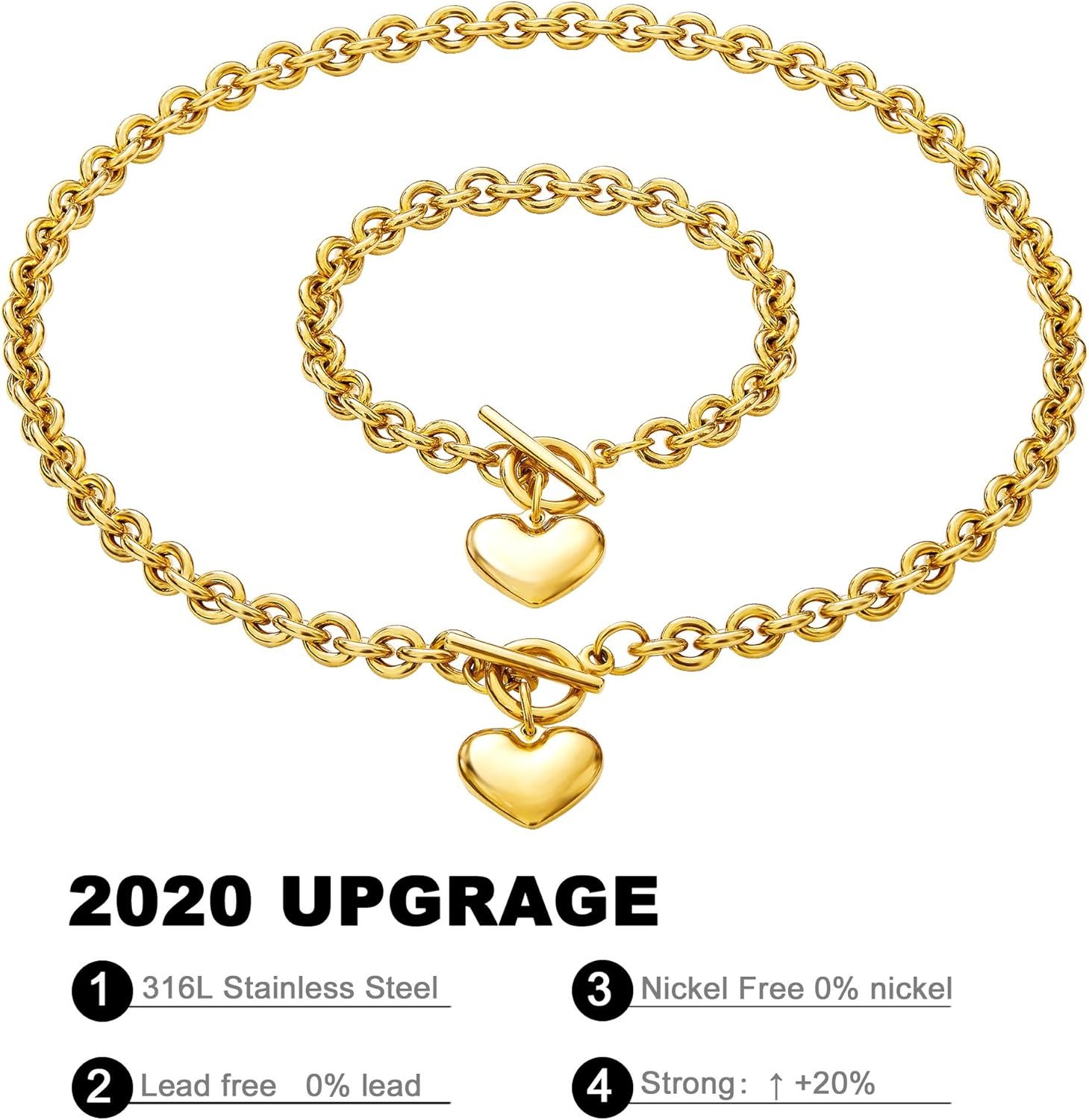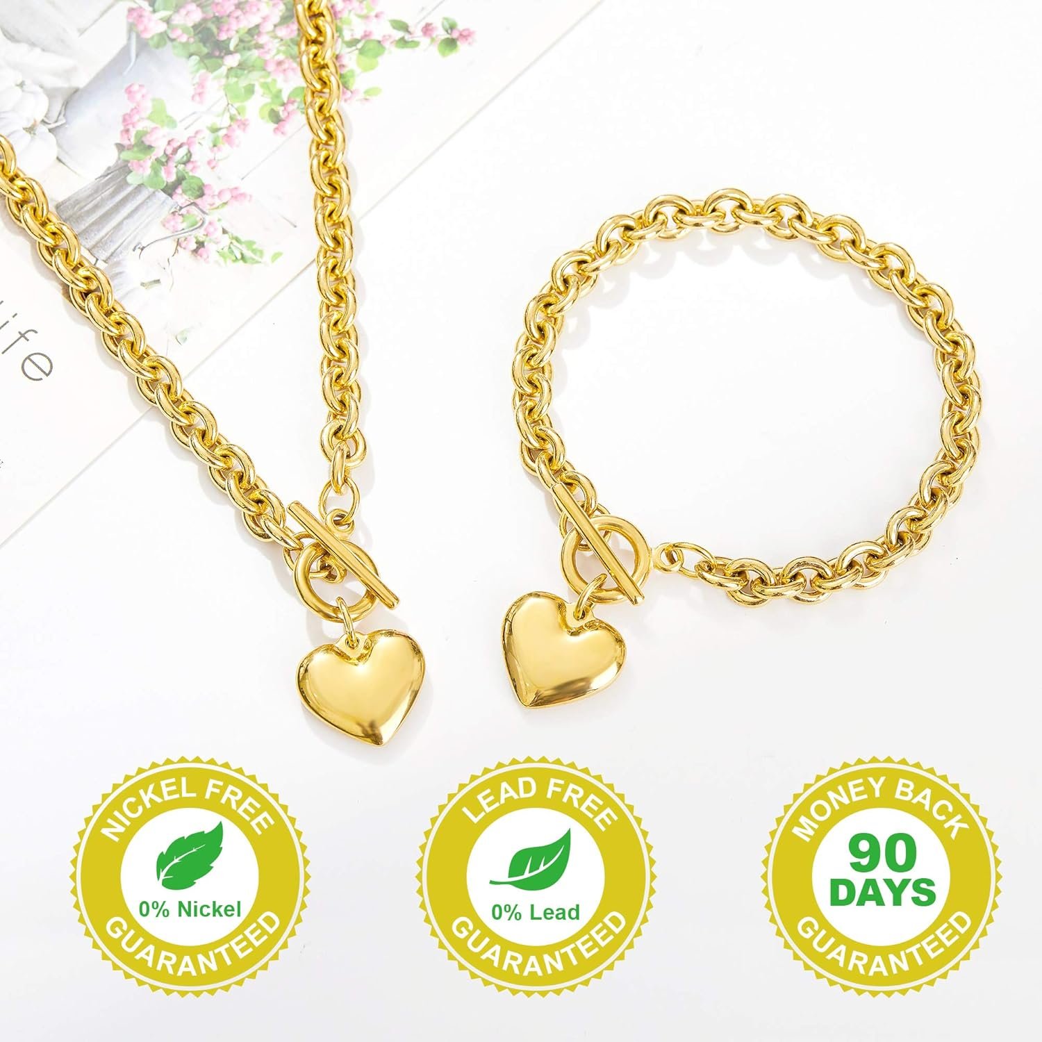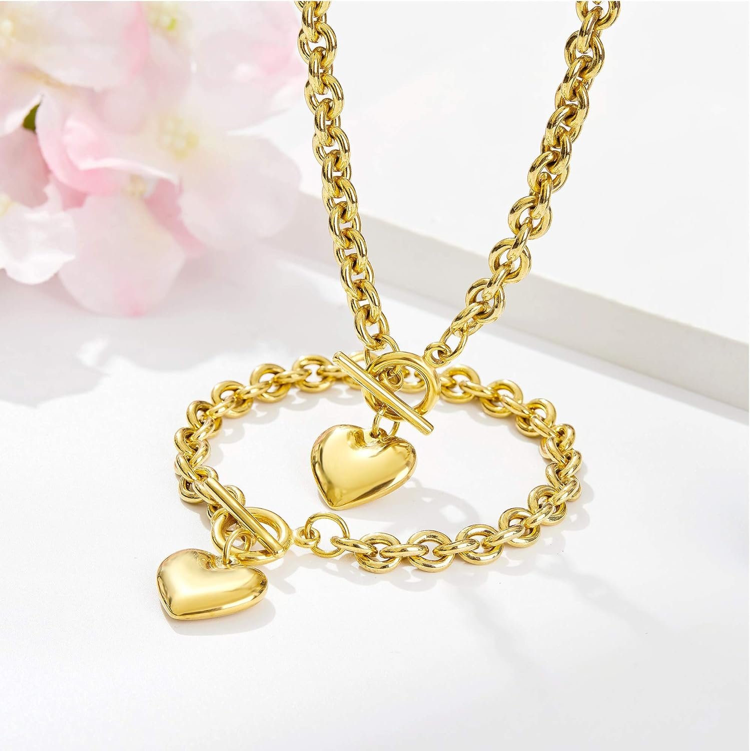 Heart Chain Necklace + Heart Bracelet for Women Girls Hearts Pendant Toggle Charm Jewelry Set Stainless Steel 18K Gold/Rose Gold Silver
