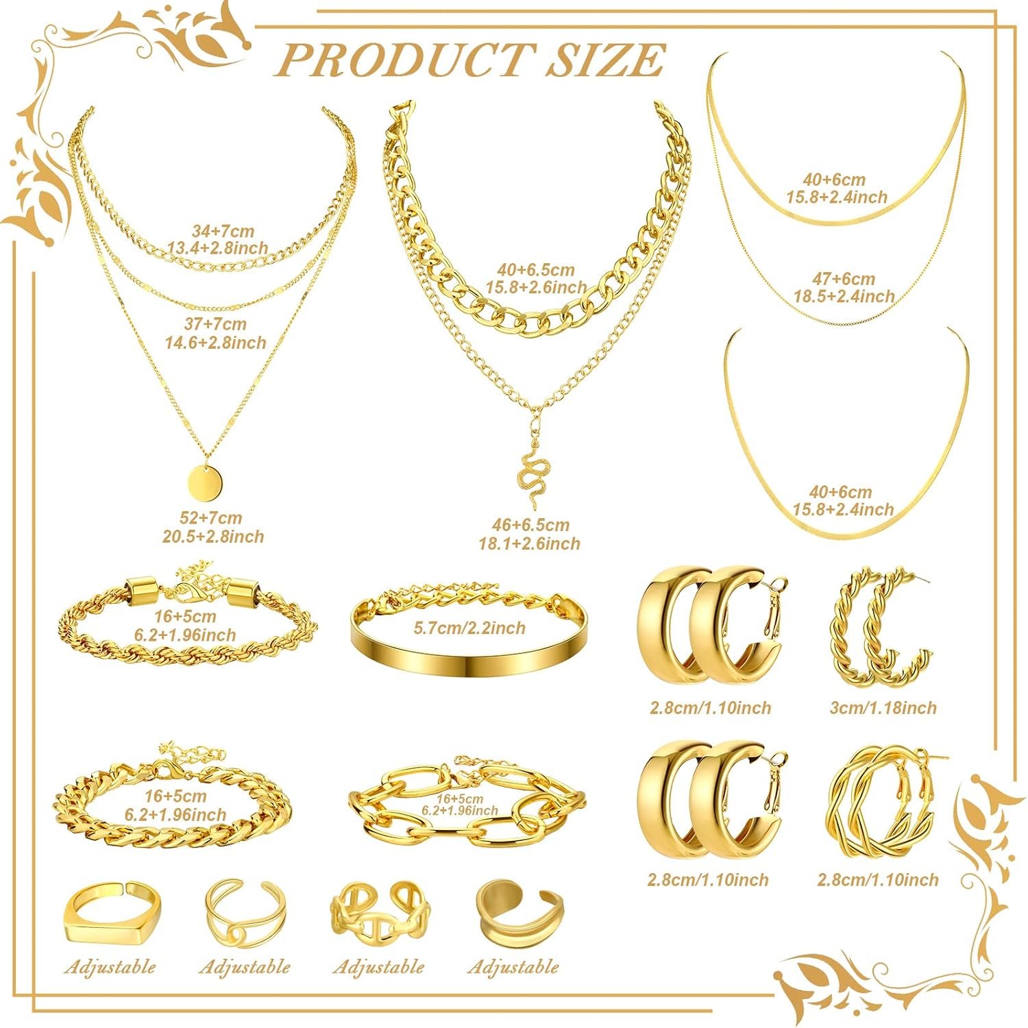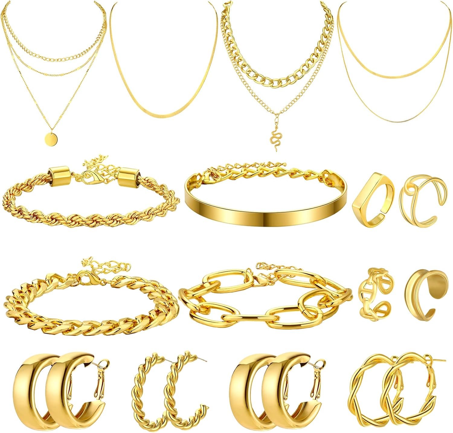 Henoyso 16 Pcs Gold Jewelry for Women Necklaces, Bracelets, Earrings, Knuckle Rings for Valentine’s Wedding Parties Anniversary Friendship Birthday Gift