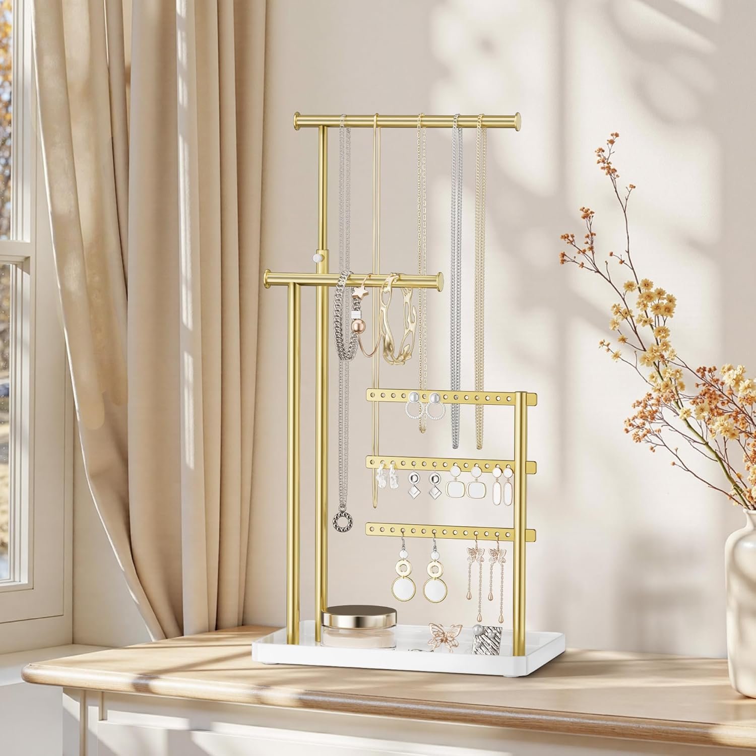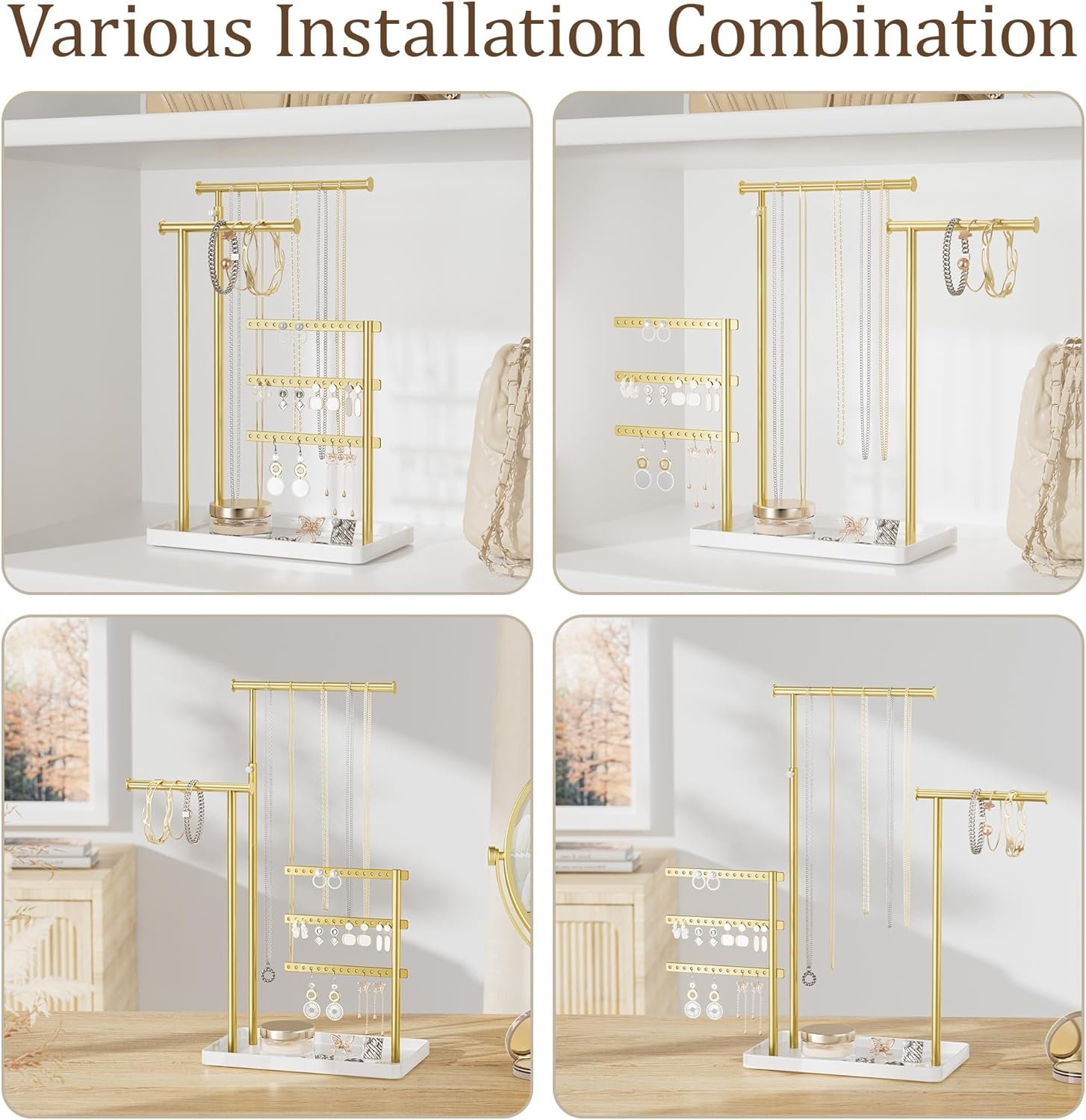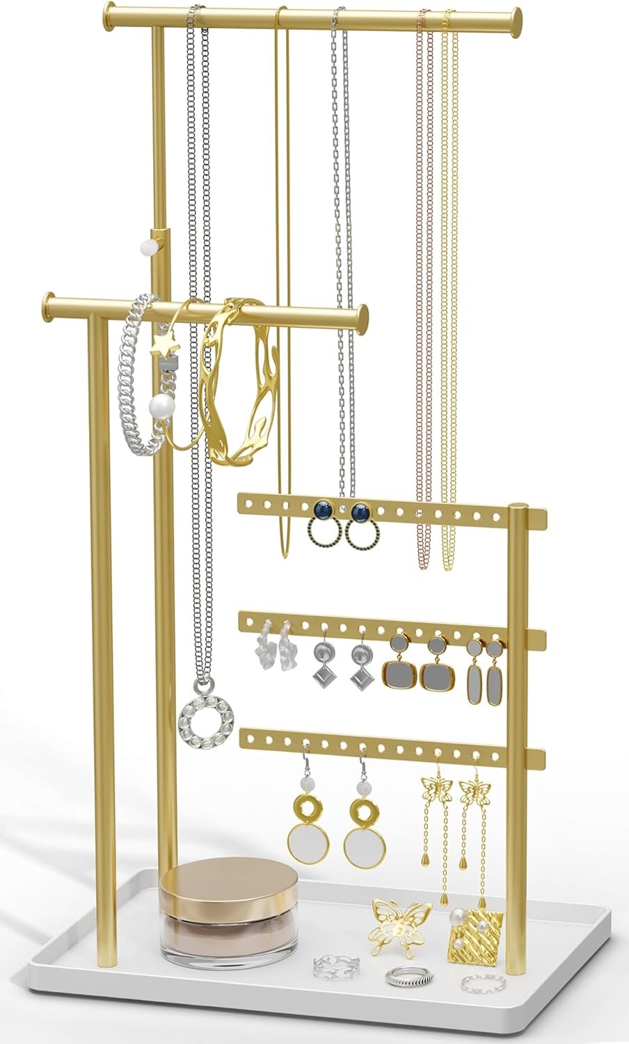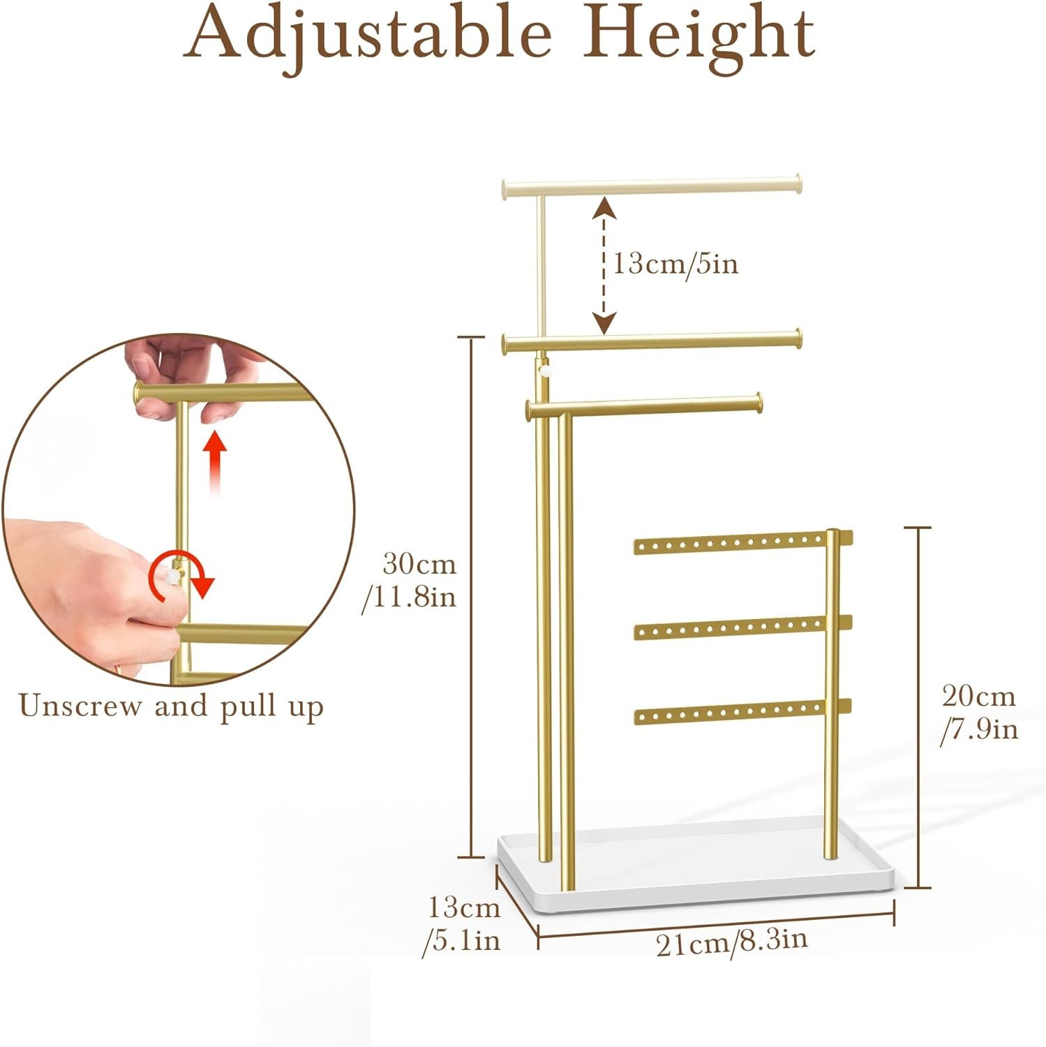 Jewelry Holder Organizer Stand – Adjustable Tall 17.5″ (Max), Sturdy Jewelry Hanger for Necklaces, Earrings, Bracelets, Rings, Jewlery Display and Storage, Gold and White, Metal