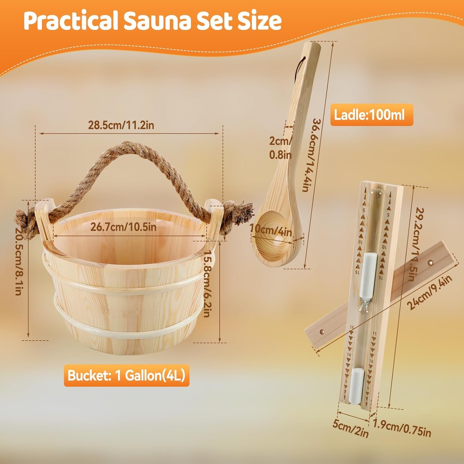 JOJOCY 4-Piece Premium Wooden Sauna Accessories Kit, 1-Gallon Handmade Pine Bucket & Ladle, Thermo-Hygrometer, 15-Minute Hourglass, Complete Home Sauna Set